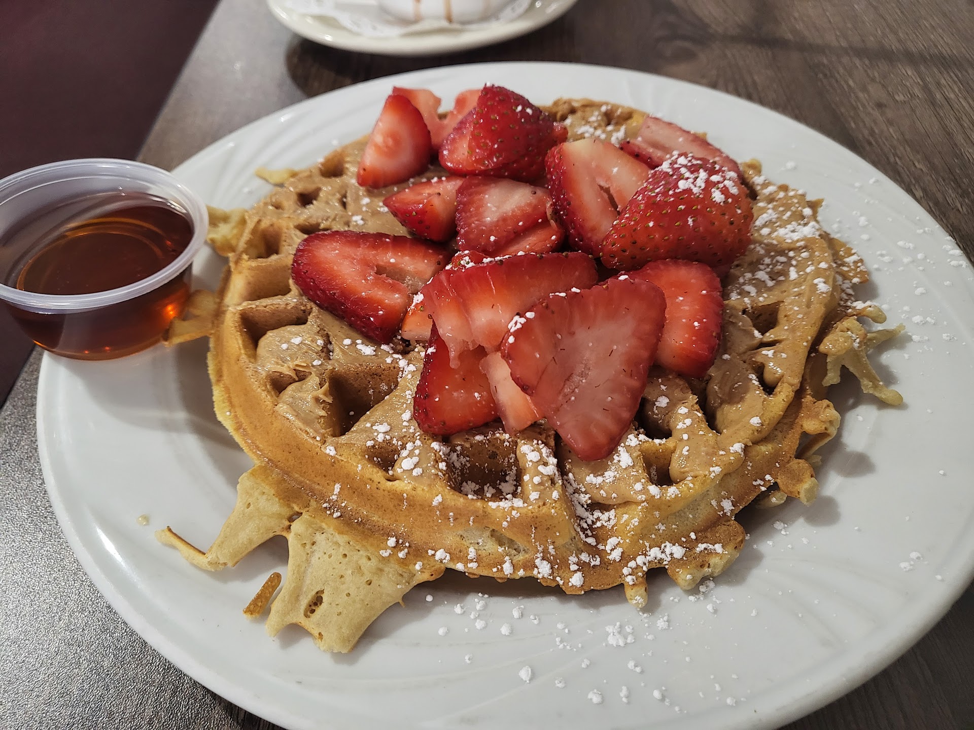At some point, my waffle came, and oh boy, was it big!!!! The peanut butter they use is a but sweet, so keep that in mind for those who may need to reduce their sugar intake. But paired with the strawberries and the hot syrup, it was 🔥! The waffle was freshly made to order and had those nice crispy parts on the sides. The waffle was able to hold up to the moisture of the toppings as well, which is always a bonus.