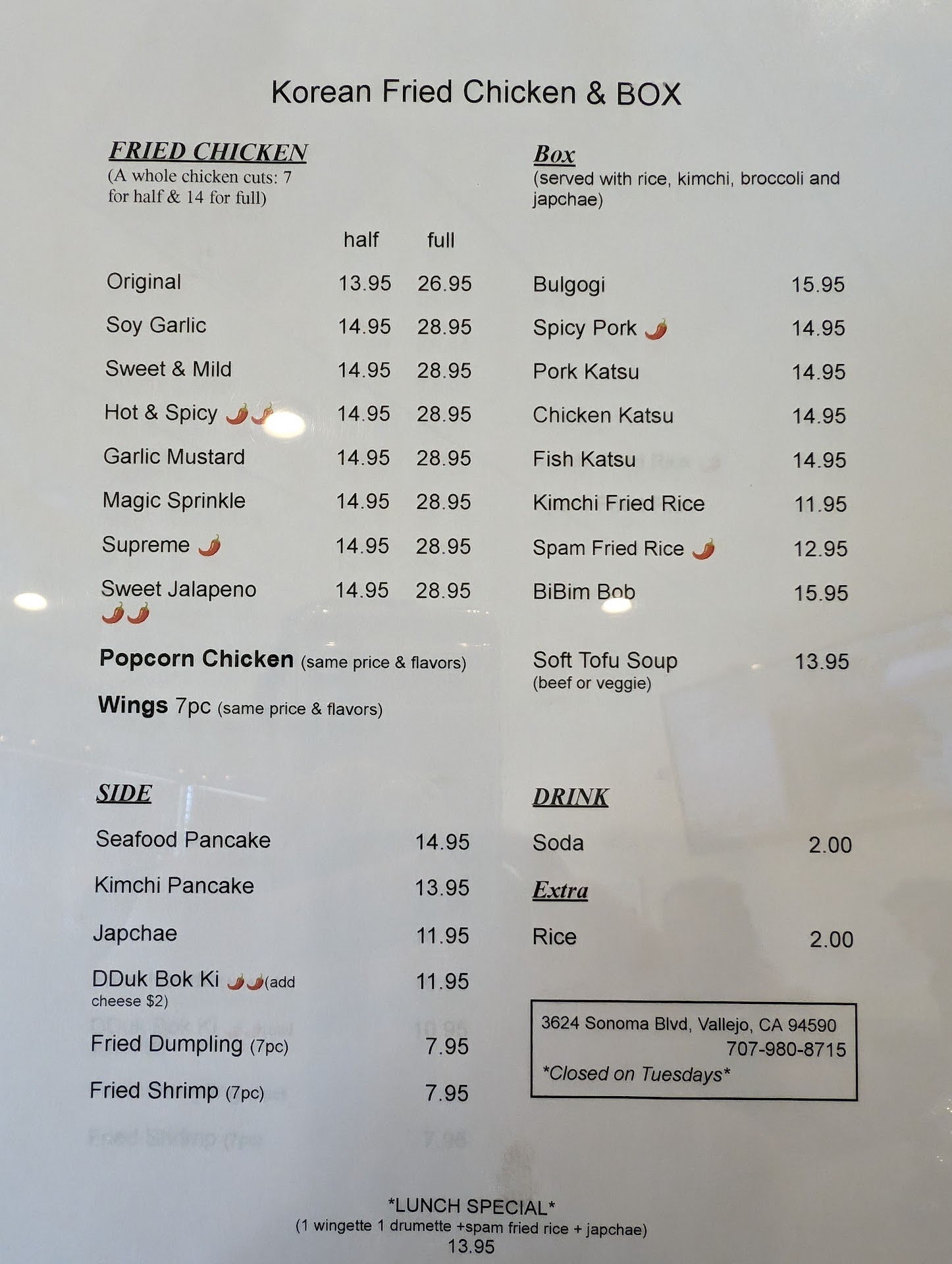 Read moreHappy to see more food options in Vallejo. I ordered take out. Fried chicken (half order) Soy Garlic and Wings (half order). The fried chicken soy garlic was GREAT! The chicken was very juicy and the sauce was tasty. I would order this again.