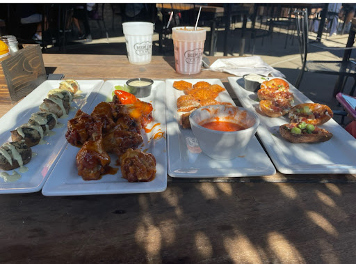 The second time we came for lunch we got the zucchini fries for an appetizer and the breakfast burger, Philly cheesesteak, fries (well done), waffle fries & tots, and we got the funnel cake fries & donuts for dessert. We also got some beer and an espresso martini. The espresso martini was the perfect blend and not overly sweet. The burgers were amazing the Philly cheesesteak could use more flavor & we feel if the bread was toasted it would’ve held up more. Unfortunately the fries weren’t well done as requested but they were immediately fixed and came out piping hot. We really loved the funnel fries, I wish you could only order those because the donuts weren’t as good as the fries but they were still good.