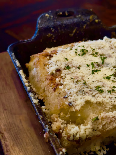 The house made bread was amazing! It reminded us of a mix of a sheet pan of garlic bread and stuffing combined. Very unique but fantastic. It was served on a small butcher block fitted in a cast iron it was baked in.