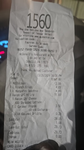 Read moreFirst off, I start work at 6AM, they open at 5:30am. So I go there for coffee sometimes in the morning. Problem is, no one ever explained to their employees that this location opens at 5:30AM. I have to wait till 5:45 almost everyday for them to even turn the drive thru speaker on. Then some days coffee is fresh, other days you can tell itâs the left over coffee from the night before that has been reheated. If someone is getting coffee as soon as you open....they are obviously coffee drinkers and know the difference. I have been told numerous times at the drive thru that I have to wait if I get any food since they have nothing ready. This is after they already opened up 15 mins late. I would love to continue but I have to order my coffee now from Dunkin doughnuts since I received a reheated cup this morning from their âfineâ establishment. Deserves no stars. Worst food quality for a McDonaldâs. i will drive to Bloomsburgâs McDonaldâs before I come to the...