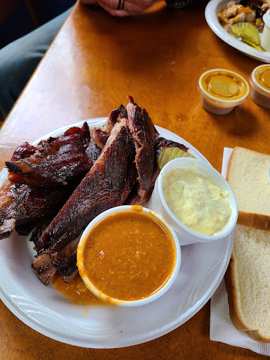 ย ย ย Read moreWe were camping nearby and decided to try their BBQ even though it had many mixed reviews. We were very pleased with our entire meal. I had the chopped pork on baked potato for 7.79 and a side of really yummy cole slaw. I like finely chopped Cole slaw slightly sweet, and this was perfect! My husband had the chopped pork and chunky pork plate with beans and potato salad, $12.95 or so. He thought his entire meal was delicious, but he really liked the potato salad. We then had a piece of coconut pie and pecan pie for dessert, both of which were delicious and baked just right. I drank some good ole southern sweet tea made fresh-- nice and sweet. (If you aren't southern, you may find it too sweet, but down here we like it like that!!) We eat a lot of BBQ, and this place was worth going to. I like that you ordered at the counter and served yourself drinks, so tipping waitresses...
