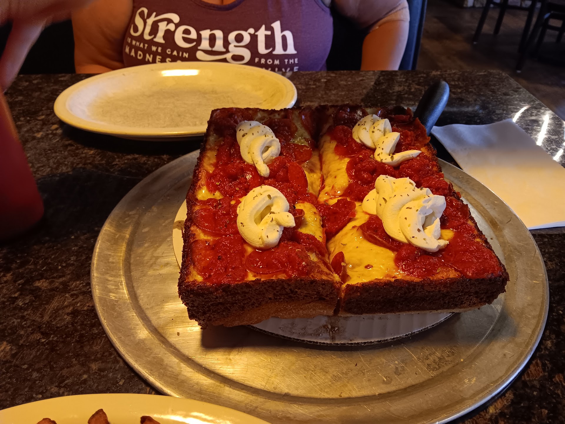 My wife ordered a Detroit pizza while I ordered the Johnny Boy sandwich. The waitress immediately asked and recommended ricotta cheese for the pizza, an excellent recommendation. The pizza arrived, well more than 1 person could eat, with a perfect buttery deep pan crust, a great sause, and again cheeses that were definately not from a distributor as they were fresh and with a complex flavor profile not found in something from a restaurant distributor.
