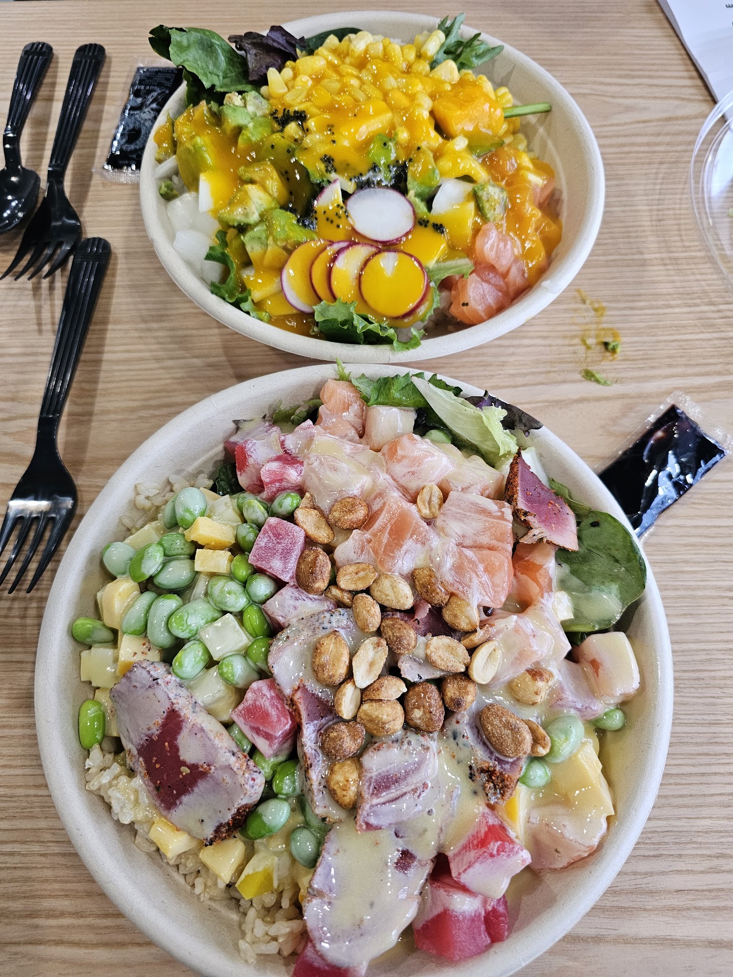 I went on my own and created a triple protein bowl. Started with ½ brown rice and ½ mixed greens then added sweet onions, edamame, mango, pickled radish, and mango, then for the proteins Ahi Tuna, salmon and peppered tuna topped with honey Wasabi sauce and sweet peanut. My tea option with mango milk tea. All were...