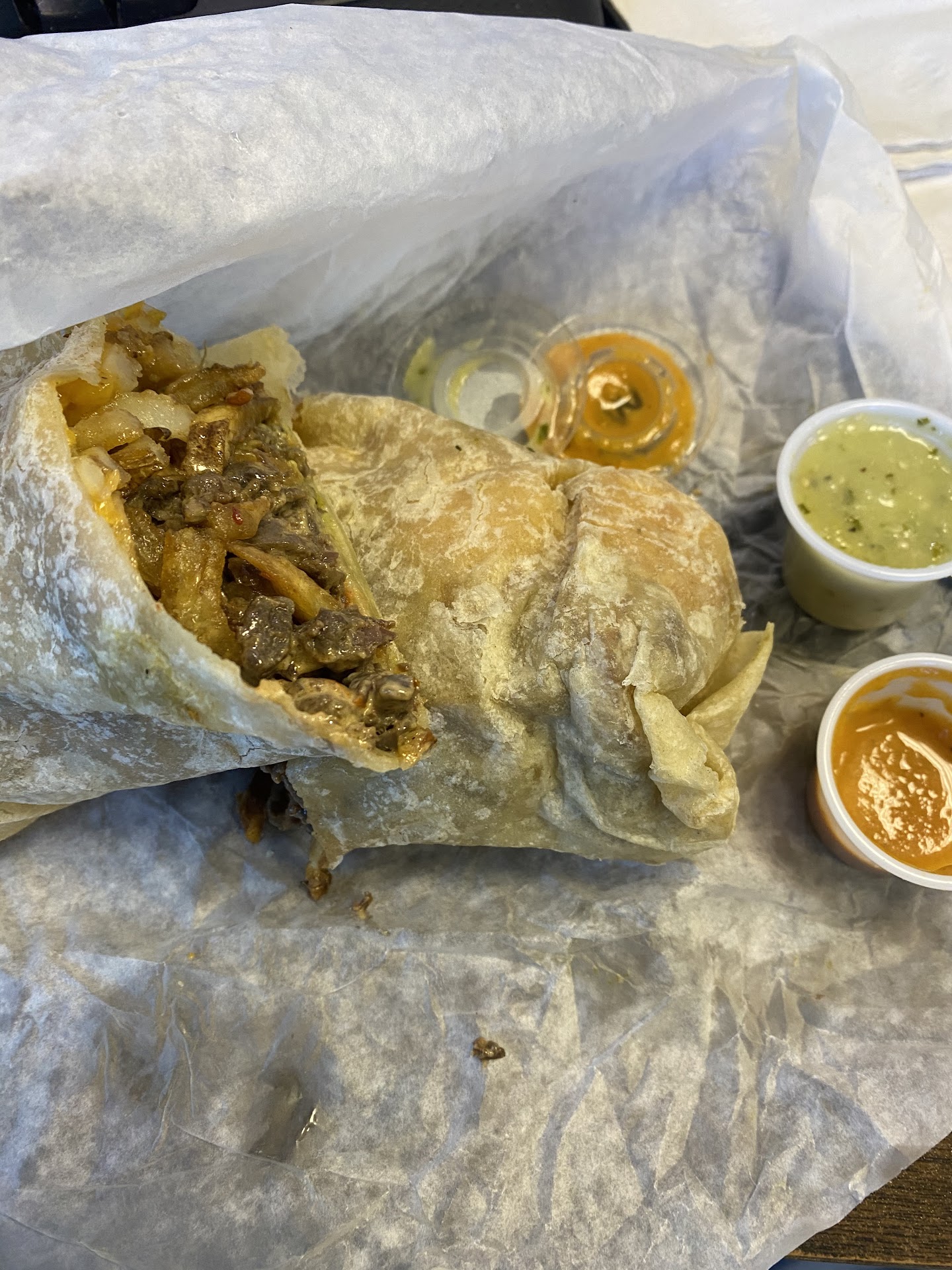 Read moreWe ordered steak burrito’s, chicken taco’s, california burrito, chicken quesadilla’s and guac and chips, to go. Service was great, people were friendly, fast in and out. As for the food, one star at best. The guac had a really weird medicine and plastic after taste. The carne asada burrito’s have the same weird after taste because it has guac in it. Ate about 1/4 of the burrito and threw it away. That aside, the steak was tough and gristly, very little steak in the burrito. The chicken taco’s and quesadilla were inedible by a 4 and 6 year old because the stewed chicken was way too spicy for them. We ended up having to make them a separate dinner. Usually my kids plow through guac, they took about 2 bites and pushed it aside. Even their red sauce is bad, it tastes like a flavorless marinara sauce. The chips, subpar. The only thing we can say that was good about the meal was the green sauce, that’s it. Very disappointing for...