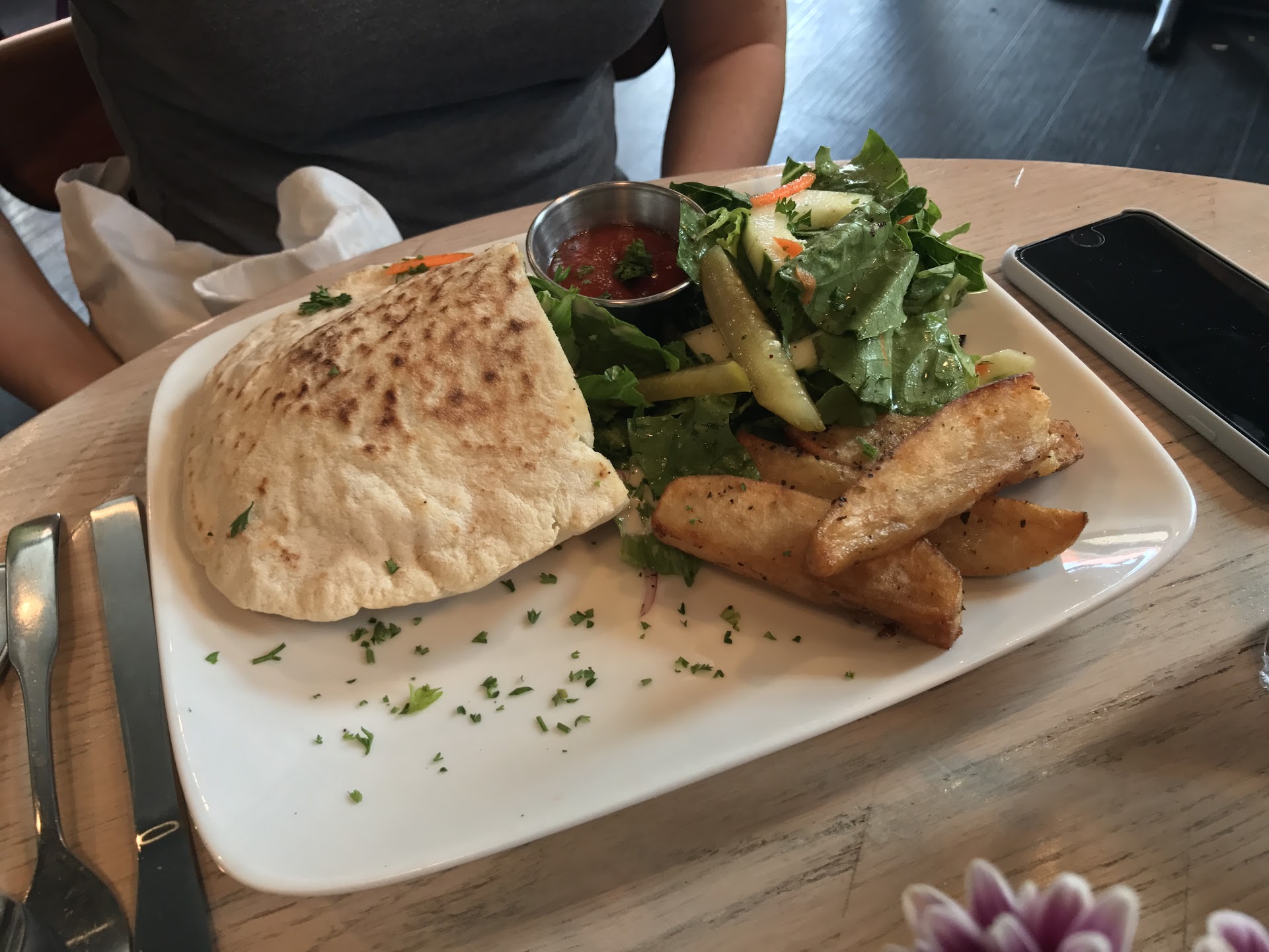 Read moreVery good food. Sat with a table of 4 people. We got the yams and some sort of beet salad for starters. Was tasty. For out meals we got the salmon(was very good and cooked very well but was a super small amount of the main star for 24$) the plate how ever was filled with rice with dill, and a green been with a white sauce and had lettuce and spinach with it. Everything else was 8 or 9 $. Another person had a Mediterranean pizza(hummus feta and tomato) tasted homemade and was that kind of thin crust that had the air pockets in it. Another two of people had the med burger(normal burger with feta and tzatziki sauce) cooked very well and was juicy with the toppings falling out with each bite(fabulous). All the food was good. Has a very close atmosphere( 30- 40 people max inside with another 6 tables outside) only issue was long wait times but the food tastes super fresh. Server of course apologized for log wait times like the poor girl was to blame. It was a...