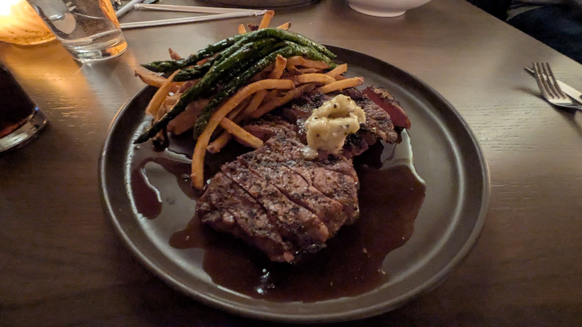 Once we finally placed our order, the wait for our food was about 25 minutes, which is understandable for a busy Friday night in downtown Valpo. I opted for the steak frites. While the steak was slightly fattier than I prefer, the truffle fries were an absolute standout. I often find restaurants overdo it with the truffle oil, but Nextdoor at Birdie's achieved the perfect balance – just a hint of truffle flavor on those thin-cut, homemade fries. They were truly wonderful.