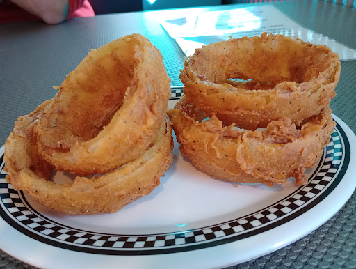 We stopped for lunch during lunch hours. Our server was friendly and told us to sit wherever. The place had 3-4 tables of older folks enjoying lunch as well. The place is cute - oldies decor everywhere and cool oldies music playing. We sat in the back dining room and I think it was a mistake because although it was quiet, there were like 3 flies harassing us throughout the meal. We ordered the onion rings as an appetizer and those were decent. The skin was thin and very crispy and did not stay on the onion, so I ended up eating the skins until the oil on them got to be too much before the meal. For our meals, I ordered the bacon cheeseburger and fries and my friend ordered the patty melt. The food arrived after 15 minutes or so and was hot. That said, my burger had almost no flavor and was super tough meat. Even after I added both salt and pepper, it was still so bland I didn't finish it. The fries were small (they were supposed to be curly fries but we're mostly the ends in my basket), overcooked, and too crispy. The ranch was runny and bland. My friend said the patty melt was also just ok. Again, the server was sweet and kind but the food was not at all good and unfortunately I will...