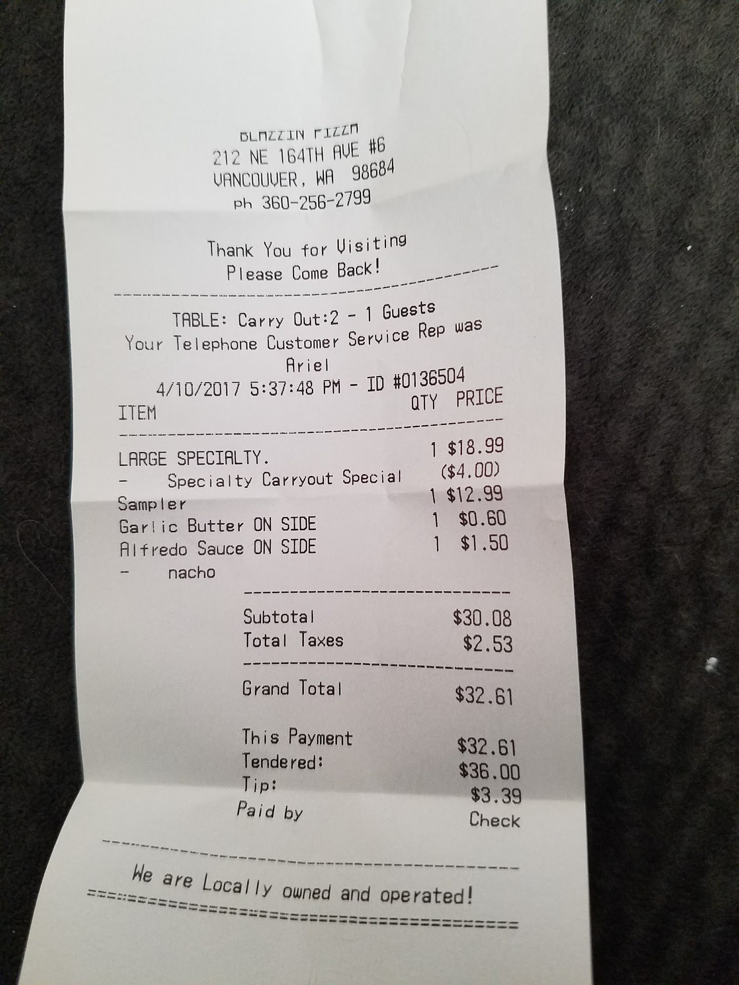 Read moreMy first experience was one for the books. I ordered delivery $50 worth of food even paid for extra ranch dressing. I was sick and didn’t feel like leaving my apartment. I’ve been ordering uber eats for awhile now but was tired of the restaurant selection so I found Blazzin Pizza on google. I realized 5 minutes after I hung up I forgot to give them my apartment number. I called back to let them know which apartment number I was in. Girl was nice she said thank you. About 45 minutes later I get a call from the delivery driver asking me what apartment I was in. You know no big deal I told him and he thanked me said he would see me in a second. Few minutes later he calls me and says he can’t find it... literally 4 apartments down he’s at 104 and I’m at 108. I walk down my staircase to show him and he hangs up gets in his car to drive literally 4 parking spots away... you know another no big deal. It’s cold I’m hungry and not feeling well. So I walk back upstairs waiting for him to knock. He knocks I have my cash ready with a $10 tip. He hands me my stuff and I ask if it’s all here and he says yes and walks away. I’m starving so I go to my kitchen and start opening everything low and behold there is not a single ranch dressing. I immediately call the delivery driver within seconds of him leaving. He said he didn’t have any ranch on the order so I thank him and call the actual restaurant. I speak with the manager she apologizes and we come to an agreement I would give my wings and potato twisters back and she was sending new hot ones with my ranch as soon as the delivery driver got back. I figured that was fair I could atleast enjoy some pizza while I wait on the rest of my food. Well a good 45 minutes go by and there is a very loud scary knock on my door I’m expecting the same pizza guy but that was not the same knock as before. My friend answers the door and the delivery guy tossing a bag of ranch packets at my friend with a short HERE YA GO MAN and takes of running down my stair case... no wings no twisters just some ranch packets and a very rude teenage boy. I say teenage because I hope a grown man wouldn’t act like that. Anyways I call the restaurant and ask to speak with the manager. The girl says the manager was on a delivery but she would relay the message and she is so sorry that happen to me and the manager will call me back as soon as she gets in. 20 minutes later the manager calls me and I explain everything once again at this point I don’t even know what would make the situation better I mean honestly I just wanted some good hot food and to relax on a Friday night. The manager insists on refunding me for the wings and potato twisters and sending a new delivery driver with the cash and some hot wings and twisters. I tell her that’s fine you know at this point I don’t even care I just wanted them to know how the situation was handled. So another 20 minutes and a new delivery driver shows up nice man no complaints on this delivery driver. But I get the food back into my kitchen and the wings are boneless. I’m just astonished. After the whole thing they give me boneless wings rather than the traditional wings I had...