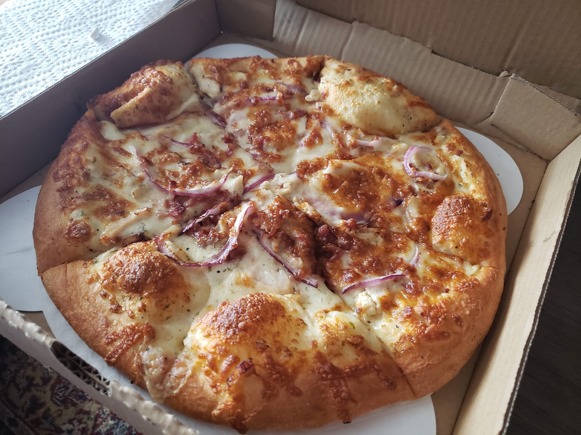 Sauces: I love nacho cheese. I tasted it before we even got home and it was terrible. It tasted like the fumes that come off of melting plastic. The marinara was okay, but not good. The garlic butter was mostly butter and just too much for me. Get your own sauces. Sides: You can tell that they made the sampler before the pizza because the fried goods tasted soggy/cold. However, they seemed like they would be good fresh. The roasted garlic bone in wings were fantastic! Tender and juicy and the sauce was just right... The sweet heat boneless chicken was not okay. The chicken tasted like frozen breaded popcorn chicken dropped in buffalo sauce mixed with bbq. I would come back for the breadsticks, definitely try those. Pizza: Let's start with the fact that our pizza came with onions (that ARE NOT listed as a topping of the menu for this pizza), let's continue with the fact that I am allergic to onions, and let's finish with the husband's opinion that the pizza was bad from the sauce to the crust. Service: Friendly young girl up front, friendly cook/delivery driver/possible owner in the back. Long wait time, 25 minutes for our order.