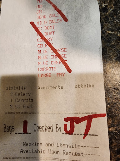 When we went to get our food the order was wrong. Part of our order included chicken tenders with wedges. They did not include the upgraded wedges but gave us French fries instead. This was the person that took our orders error.