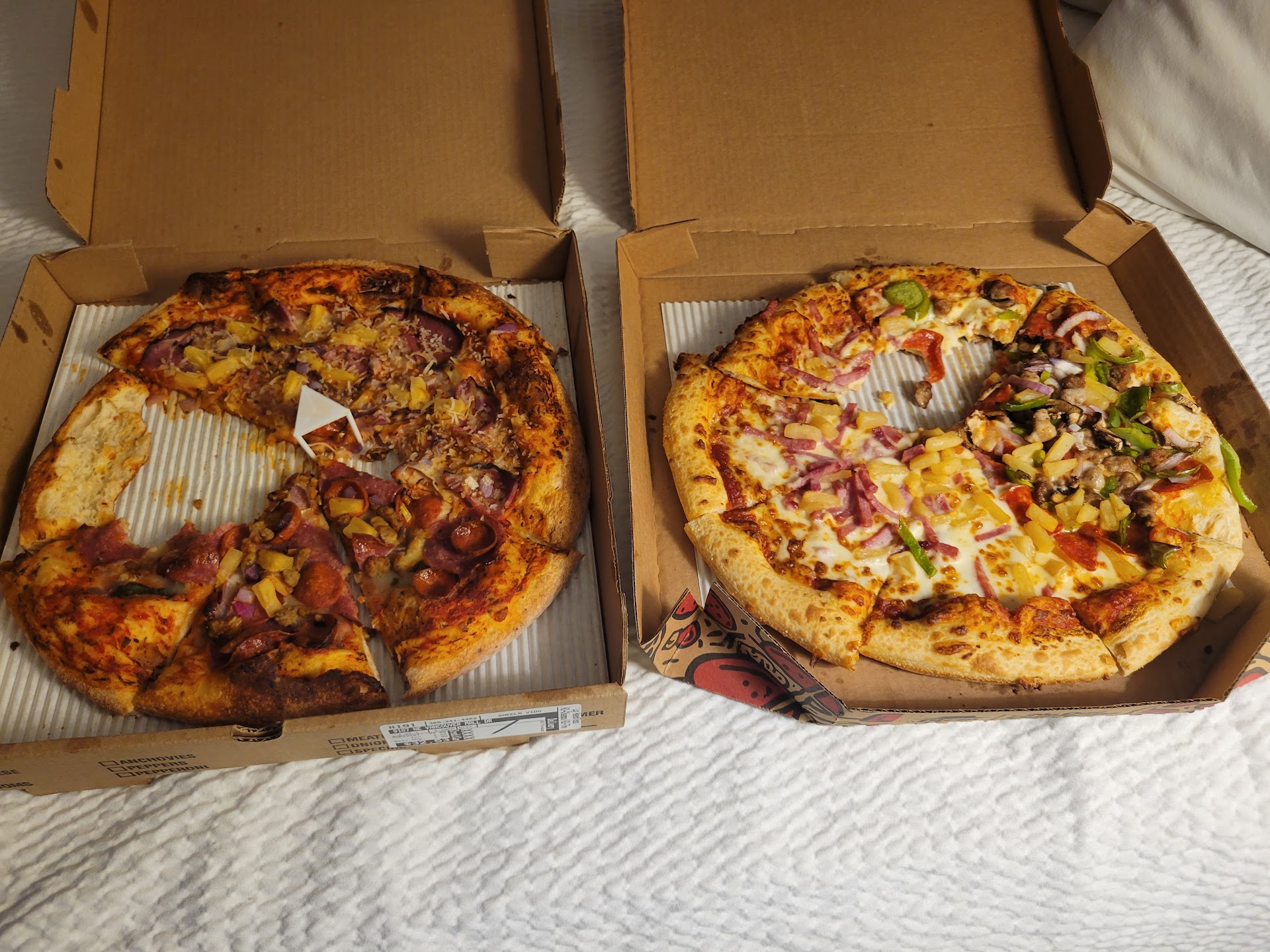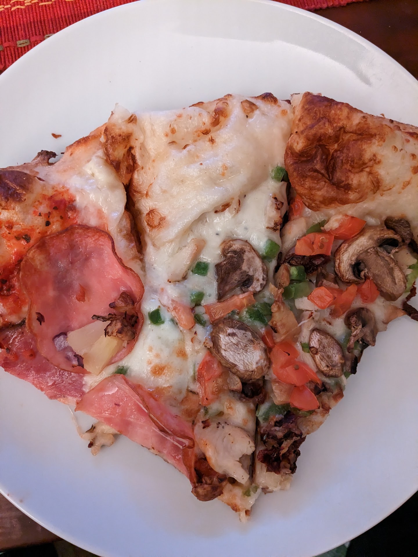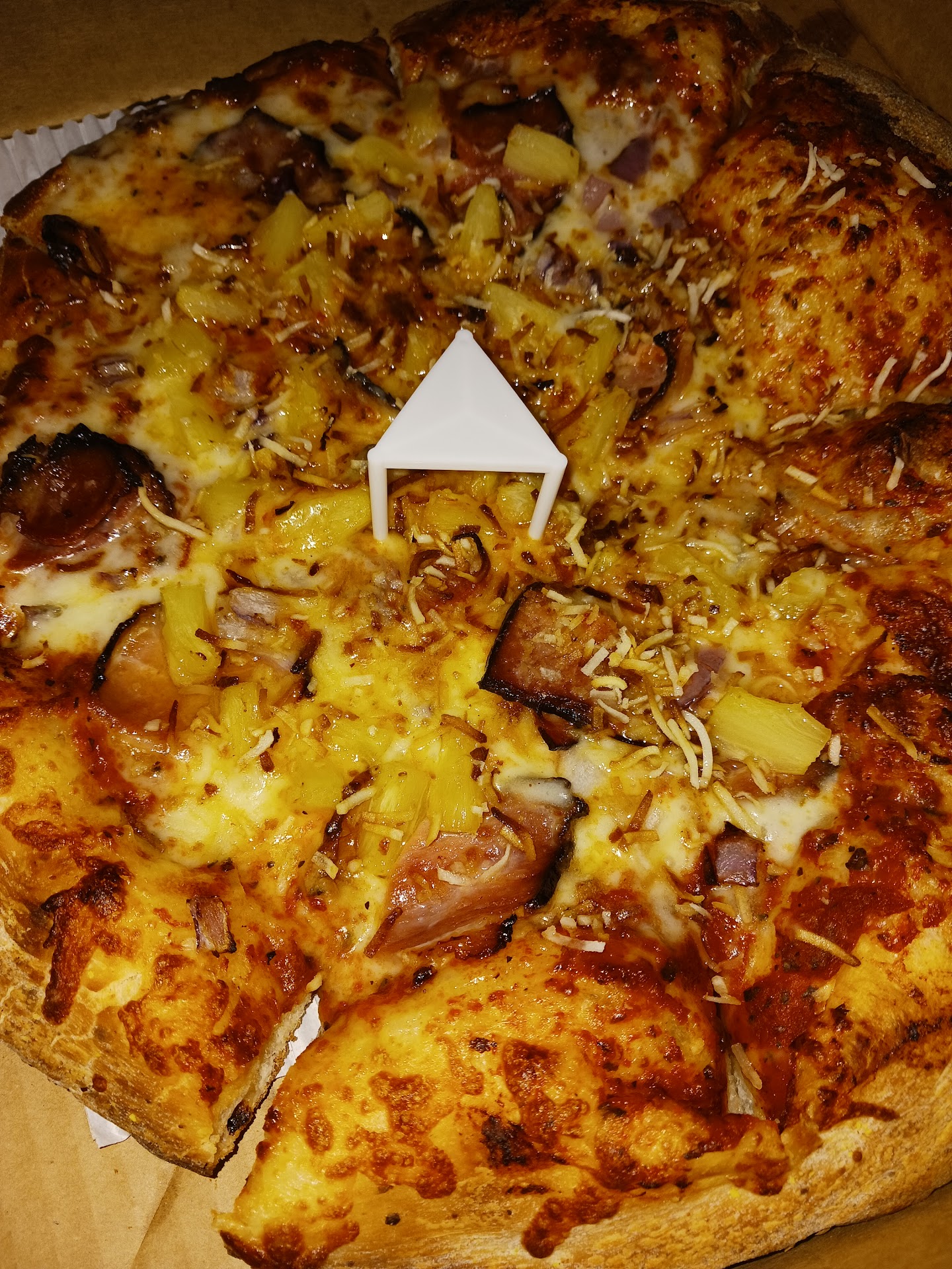 On my third visit I got their Hawaiian pizza which is what I got the first time(this time I have a photo and video). Again I ordered ahead but this time, when I got there, someone helped me right away, and I was in and out within a minute. The pizza itself tastes good, but all the toppings were in the center of the pizza. When I tore apart a slice, it just fell apart.