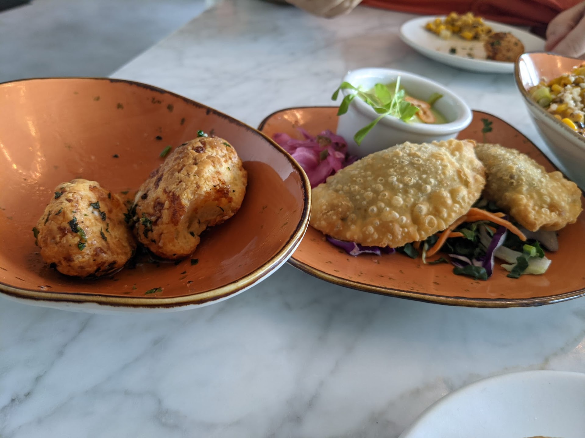 To start, our food order was Brazilian cheese bread, short rib empanadas, street corn and pork belly skewers. The cheese bread was jealous but as I bit into it, liquid came out onto my plate and my shirt. I am not sure if it was oil from the deep fry or from the garlic butter. The price for the bread was also high I thought. $8 for four pieces of bread, each about the size of a donut hole. The empanadas were really tasty but the filling was barely warm. Since they were served to us as soon as they were ready, I would have thought they would be hotter. The street corn was tasty but I am a spice wuss. I can't handle hot/spicy foods so could only eat 2 forkfuls. My husband gladly ate the rest. I was really looking forward to the pork belly but this dish didn't have a lot of flavor. It was sweet with the sauce but the pork itself was mediocre, We also ordered the lamb chops which I really liked, but I did not feel it was a $22 dish.