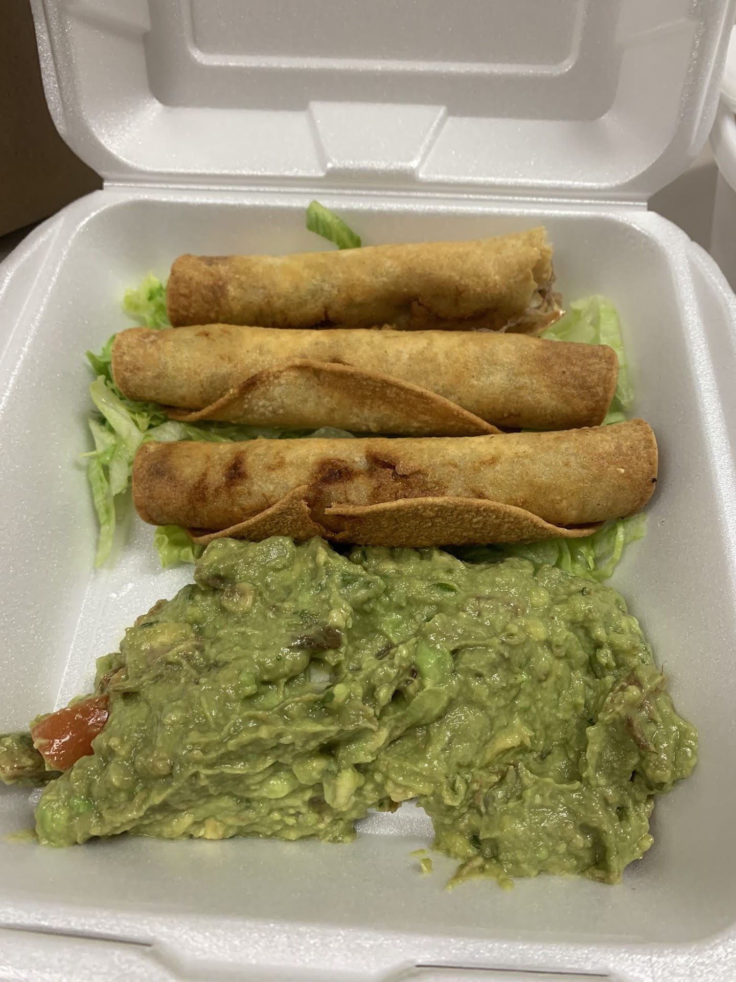 However, the service sucks. Long line, a lot of people waiting for their food. Including me, I ordered ahead for pickup online so I could get my meal right away during lunch break, but it seemed as though they didn't start preparing my food until I arrived. So I had to wait a total of fifty minutes for my taquitos and rice. At least it was fresh and they gave me utensils like I asked, though they didn't follow my "no sauce" request. I wasn't the only one disgruntled by the slowness and lack of attention based on the conversations...