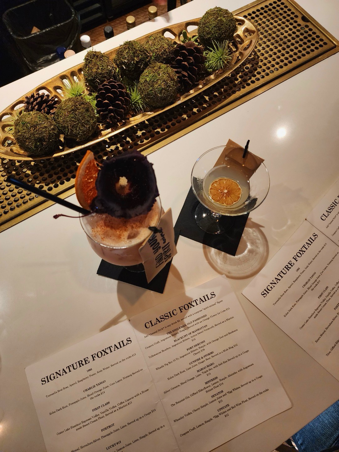 I have been anxiously awaiting the opening of Foxhole which is a couple blocks from my house. The building has been many things before it was resurrected and turned into the coolest cocktail bar in downtown Vancouver. Every detail put into making this bar feel swanky yet comfortable is impressive. The booths are comfortable and semi private. We chose to sit in a booth because we had friends joining us. We ordered at the bar I am not sure if they have table service which is not a game changer for us.