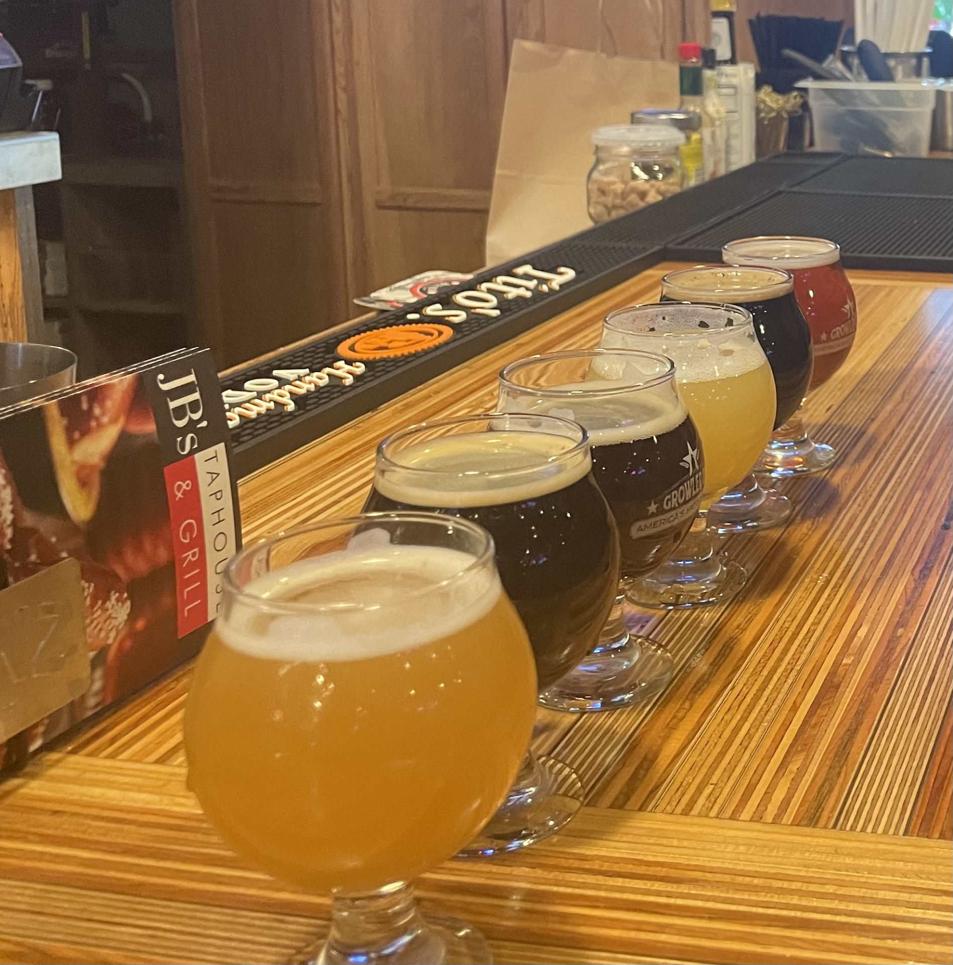 We sat down a water came to our table, slapped two coasters down and asked if wee needed a minute. We said - "Yes". The waiters never came back to our table. We were clearly ready to order as neither of us were looking at our menus. We tried several attempts to make eye contact and wave someone down to take our order. Every single employee ignored us. After about 30 minutes of this, I got up and stood at the bar. Everyone had been served at the bar. The bar tender was drying some glasses. When I came up he walked past me a couple of times. I said "excuse me" but was ignored. He proceeded to chat with the customers on at the end of the bar and continued to ignore me. I went back to my table really annoyed. If you have enough time to organize condiment bottles, you have time to take a customer's order. Needless to say after 45 minutes of completely being ignore. We walked to the other restaurant across the parking lot where we had excellent service and food. I would not recommend JB's Taphouse.