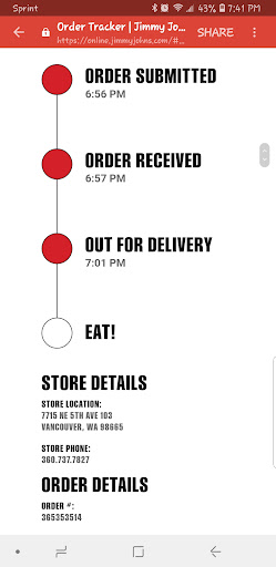 Read moreI am very disappointed in Jimmy John's. Not only did it take over 40 min to deliver less then a mile away (freaky fast??? -i could of made food at home and eaten it faster) Also, the bread was soggy on all 4 sandwiches, we asked for reg yellow mustard on a sandwich for my young son and he got grey poupon and refused to eat it. My #12 had no cucumbers on it even though it comes with them, we asked for mayo and mustard packets on the side as well, yet received none. I got a total of 6 items and literally, only (1) napkin in the torn all the way down the bag that was delivered. Overall horrible review and it really only takes a bad experience to not go back again. The hazeldell location is surrounded by a ridiculous amount of other options for dinner that don't disappoint, so it's quite easy to not have to order...