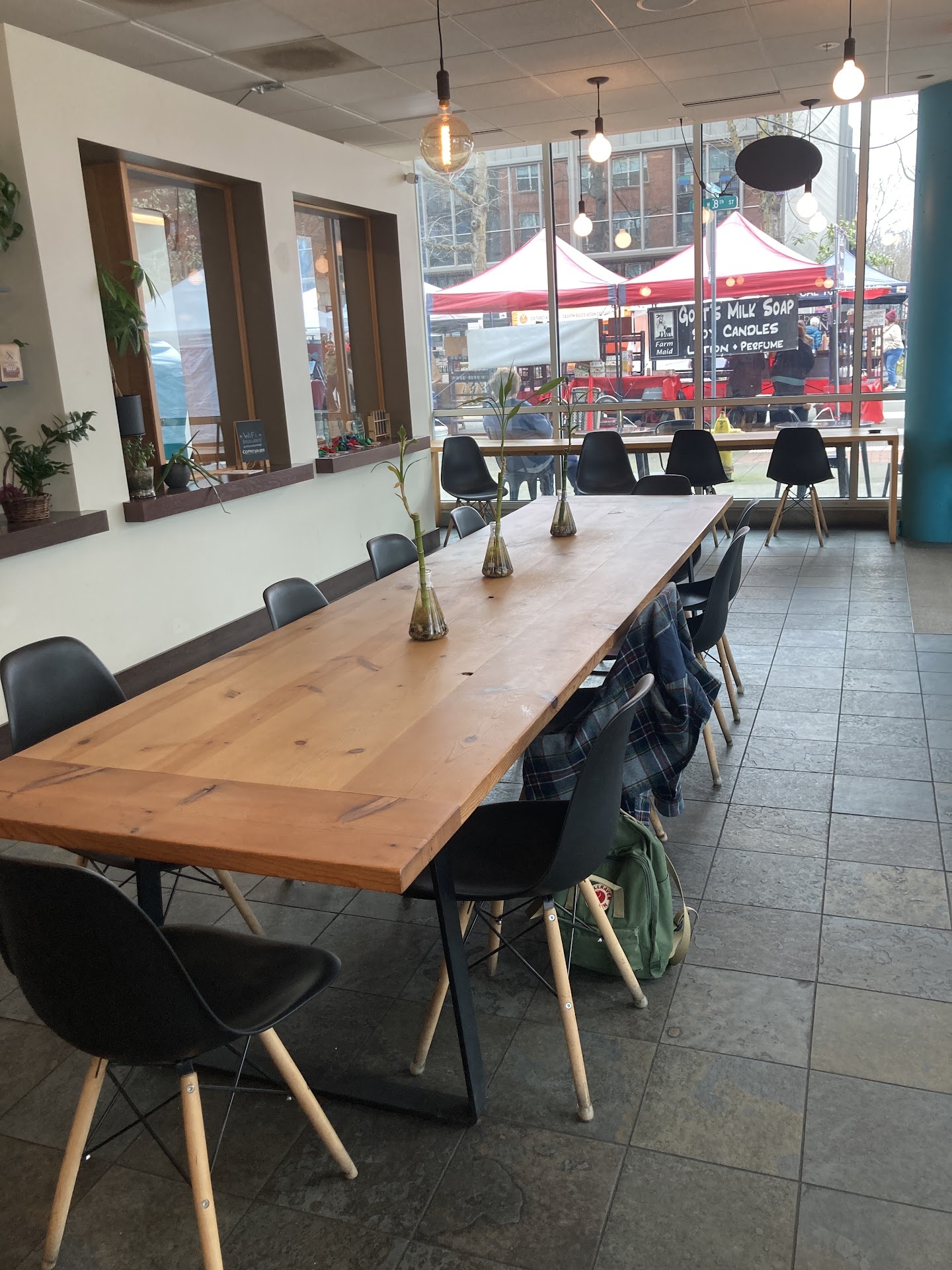 Read moreGreat coffee! Both of the girls there were very friendly and helpful! They have lots of outdoor seating, and some under a canopy too. The cajeta (goat milk dulce de leche) latte was balanced just right, and the normal latte my mom got was great as well. FYI, if you prefer less fruity coffees I would mention it. They only do classic sizes. They also do pour-overs and siphon coffee (very cool). The bakery is absolutely oustanding!! Shown is a (vegan) oatmeal cookie that was simply amazing. On the shelf they have turmeric honey drinks, 1 decaf and 3-4 choices of coffee roast/blends, and a chai blend (just 7g of sugar :D). They also have a great collection of books to read while there. Its the perfect location too, Esther Short Park right next to it has many places to walk and sit, or go down to the waterfront. Another note of detail - the shop and designs are beautiful. I really like the blue recurring print with various coffee devices, it would make great wrapping paper on the holidays. The design of their coffee bags are some of my favorites, and the valve does not get in the way when you roll it up (pet peeve of mine). Update: The siphon brewing is really cool to watch, and the resulting coffee(using the three amigos blend) was very clean and bold. The oatmeal bar is sweet and 'indulgent', and the biscuit my mom got was perfectly delicate with a slight bit of rosemary. Still...
