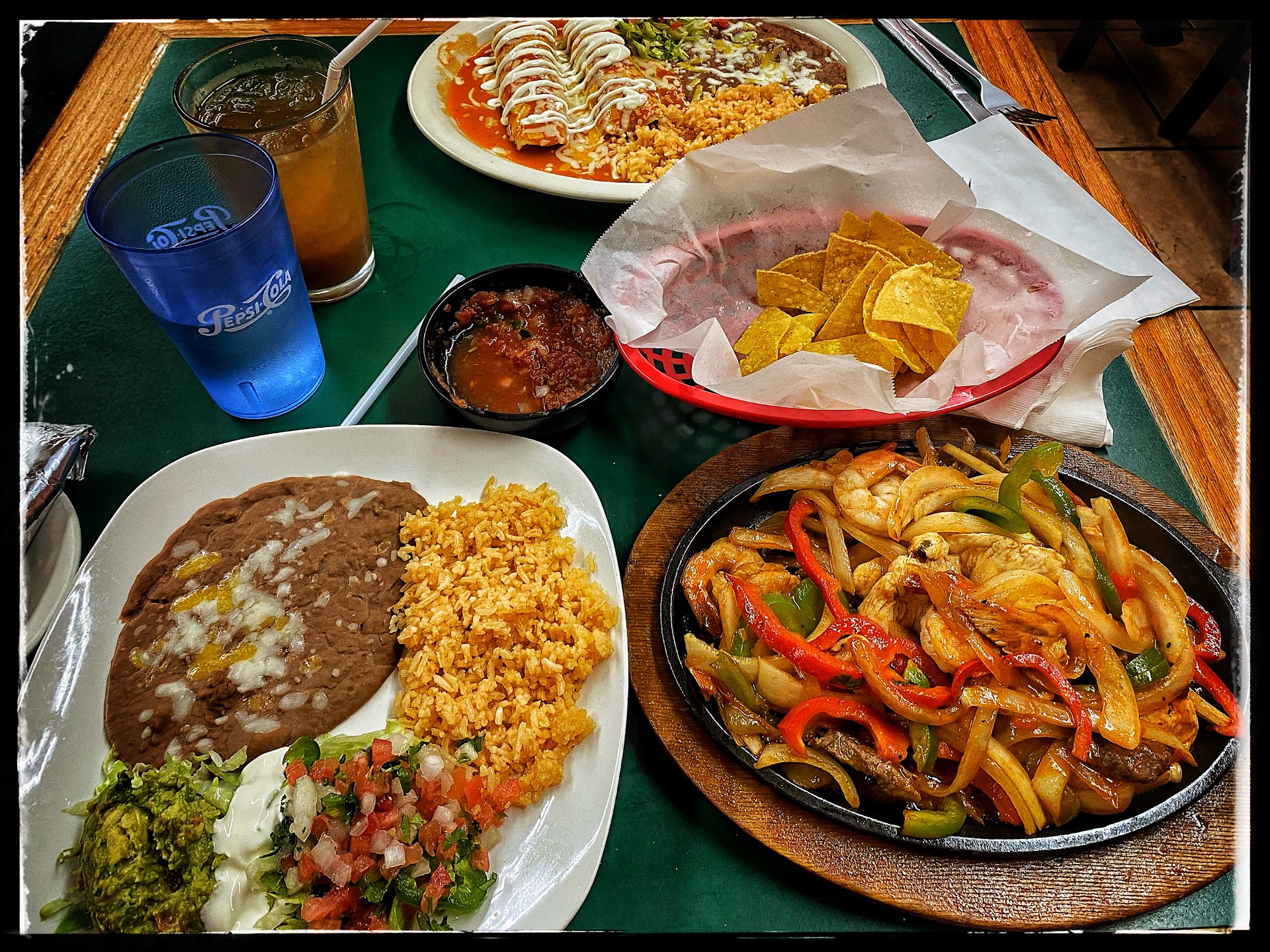 One of those places tucked away around the corner you could pass by for years and never notice. Your loss. Interesting menu beyond the taco/burrito/enchilada, not the standard tourist fare. The chips were crunchy, the salsa tasted fresh, a bit of bite, but not flamethrower hot. I had the Fajitas with Shrimp, Beef, and Chicken and it came to the table sizzling and hissing like a mad cat. My wife had a Chicken Enchilada and loved it. My Fajitas were perfect and came with my choice of tortillas (I chose flour). The place feels like a good solid neighborhood meeting with a friendly and welcoming vibe. It was clean and simple and the waiter was great. One bad thing was the Tamarindo had been in the machine too long and was starting to ferment, it tasted “off”, we will try again later and if it happens again, we’ll knock off a star. Everyplace gets a second chance if the food is good enough. Next time...