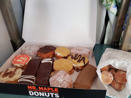GLUTEN FREE DONUTS at Hazel Dell location are why I decided it was time for a donut. It's hard to find fresh gf donuts so I was excited. I had called ahead to make sure they had gf (highly recommend this) and they did! They had white cake donuts with chocolate icing, maple iced, and plain. I ordered two of each (for research!) and I requested that the plain be vanilla frosted with sprinkles. When my husband and I arrived my box was packed and ready and he just needed to choose his. The two women behind the counter were helpful and smiling. There was a family in the store at the counter when we entered and clearly marked distancing stickers on the floor. Everyone was wearing masks and there were signs to ensure everyone was safe. Were the donuts good? Both my husband and I tasted donuts that were really fresh, soft and yummy and donuts that were not as fresh and soft. His double maple was not very fresh and somewhat stale but his boston cream was really good. My chocolate frosted were inedible as anyone eating gf knows our breads can get a mealy, sand-like texture when it'saged. The maple flavoring was meh for me. Having said that, my vanilla frosted were AMAZING. Do they taste like regular flour donuts? No, of course not. Are they a really great gf donut? Yes! Texture was soft and chewy and the vanilla was a great flavor. For me it's all about being included when we want to go get some food. When we want donuts we will no longer head to our local shop (Donut Nook which is amazing too) but will drive a bit farther so I can get GF. Thanks Mr.Maple for making this gf mama feel included. Highly recommend. GF ONLY AVAILABLE AT HAZEL...