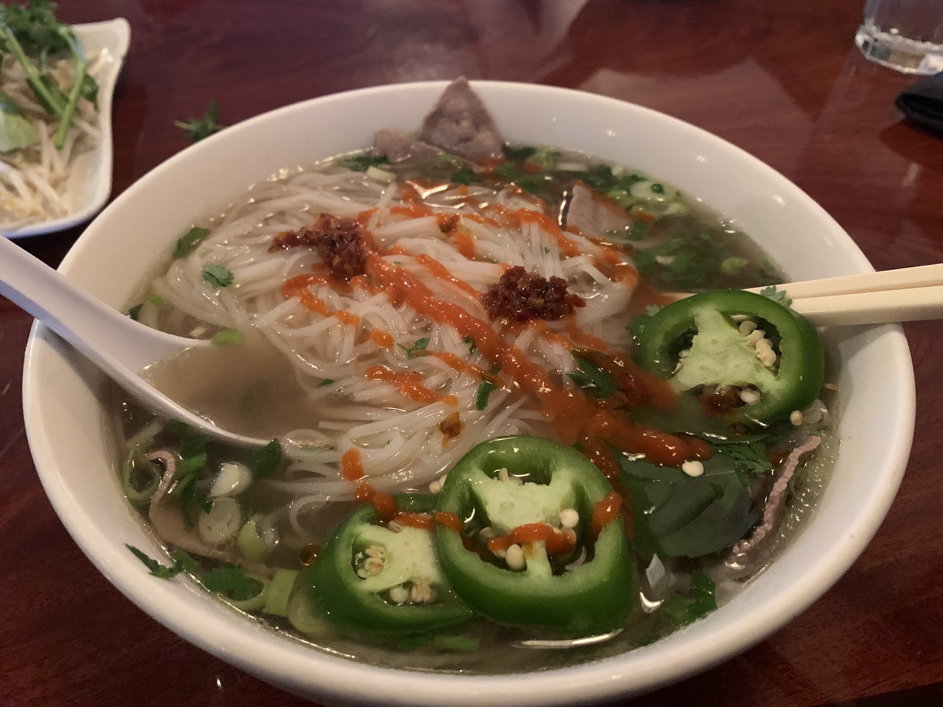 Tonight was our first experience there. Our order was brisket & top round (possibly also bottom round) pho, 2 thai teas and one over of pork only spring rolls) I asked for NO heat with the pho. They put jalapenos in the bag with the sprouts. What they seem to not understand is that when you place a sliced (with seeds) jalapeno in the bag with sprouts that you toss in wet (little puddle of water at the bottom of the bag) everything become spicy. So my mouth was a little uncomfortable w/ a runny nose. I've never has brisket before like they do, there was just solid cbunks of fat, small, chunks of fat with a little meat attached, so I had to dig through my food (before putting in the broth, which they gave a great amount of) to remove chunks of lard. The drinks were the ones they put in the machine, it seals a plastic sheet on as a lid & you need to puncture it to drink. Well I guess they chose to puncture the drinks, put 2 thai teas in a plastic bag, withholes punctured (wouldn't you leave that for us to do to avoid spillage??) with straws. The drinks were spilling so there was thai tea all over the inside of the bag, the straws were drenched & the cups sticky wet. (Now this is a party 🙄) The spring rolls were the Only thing that came as asked & acceptable. I don't normally give reviews like this & I don't like to; I prefer receiving amazing food & giving good reviews. Honestly the portion sizes were better than acceptable & the staff were very polite. I wish I could give a better review, maybe if they read this they can ans are open to changing...