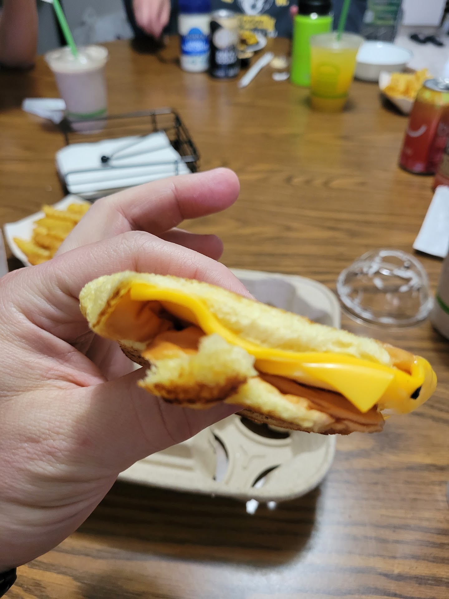 We were there at what seems to be an average lunch time. There was no one waiting to order at the kiosks and plenty of open tables. Approximately two minutes into our wait, I watched our two shakes and iced tea get added to the rack of approximately 7 to 8 other shakes and at least 10 other sodas/lemonade/teas. 15 minutes into our wait, my husband went up and asked if he was able to get our shakes that were sitting there. The employee said, “No, we will bring them to you with your food.”