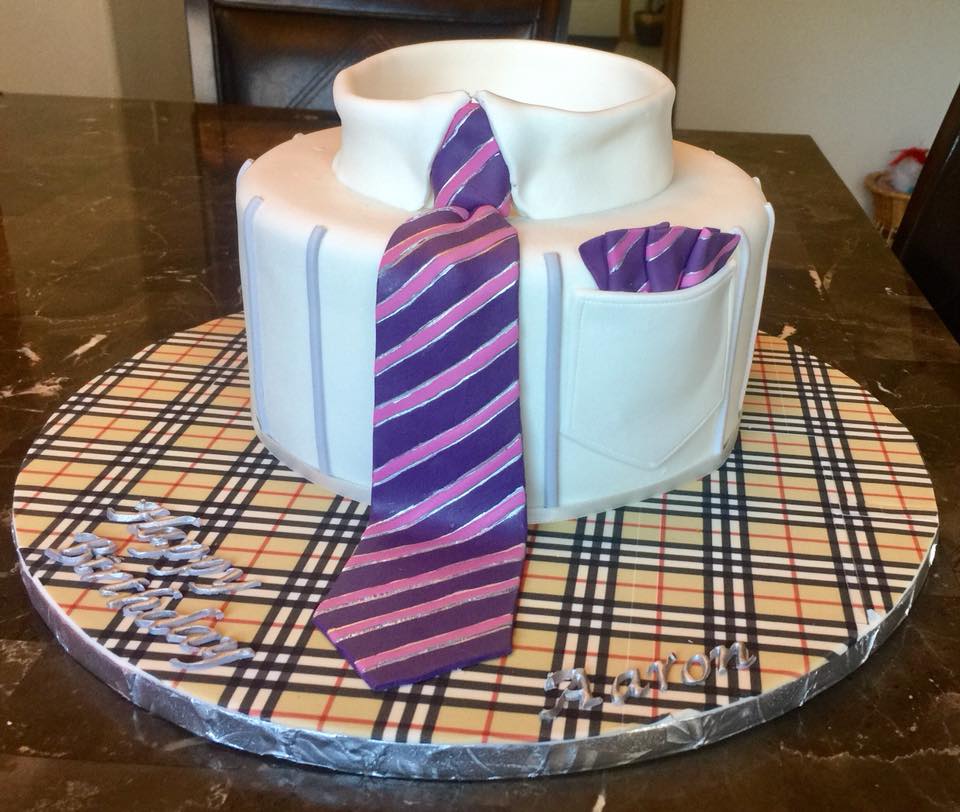 I provided a photo of my husband's actual Versace tie to use and suggested using a Burberry print (which she said could be printed out on paper and the cake displayed on it) and a Tiffany tie bar (which apparently never made it to the final cake). She showed me the rough sketch and I suggested adding grey pinstripes to the shirt to make it pop a bit more instead a huge expanse of white shirt.
