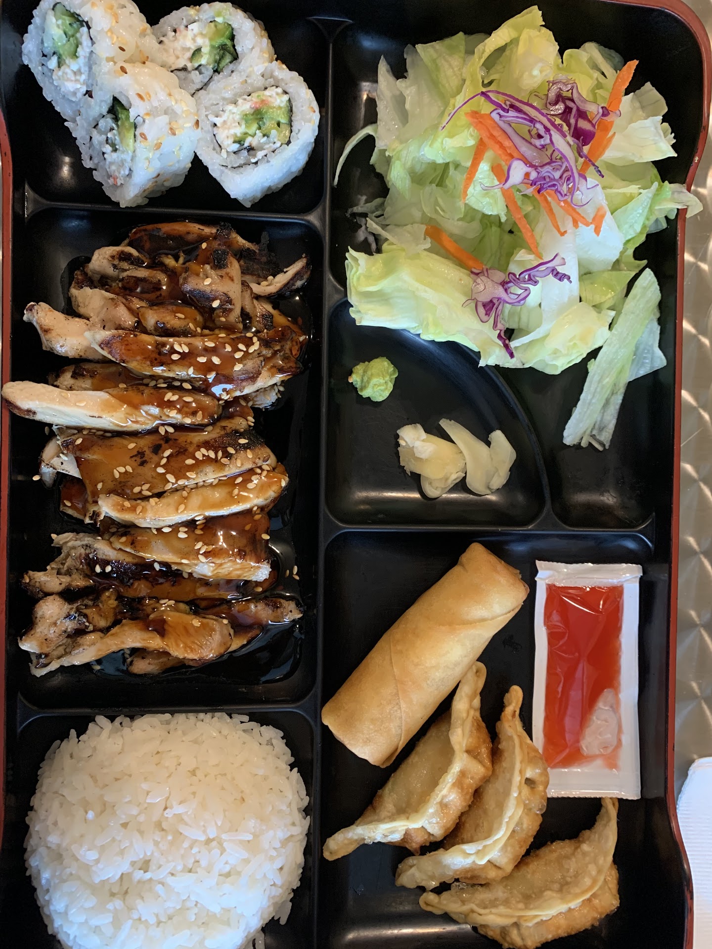 We get the Edamame and it really is the biggest plate I've seen in a Japanese place, but recently we've been to places that excelled at this humble snack. They scattered rough salt freely and these tasted like they needed a bit more taste. Not bad, just not special. My wife gets MIso, which she likes and I get a Chicken Bento. The Gyoza are a disappointment as is the spring roll. Absolutely nothing of interest here. Maybe I'm wrong, but they do not taste remotely home made. The chicken teriyaki has a good strong char, but the sauce lacks any character, no one here is cooking with joy or creativity. My wife gets the Panko Shrimp and they look suspiciously like the ones from Cash and Carry. Along with a packet of standard sweet sauce. No one here is trying.
