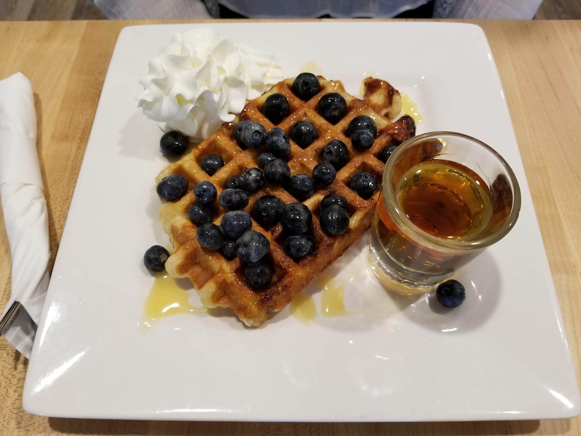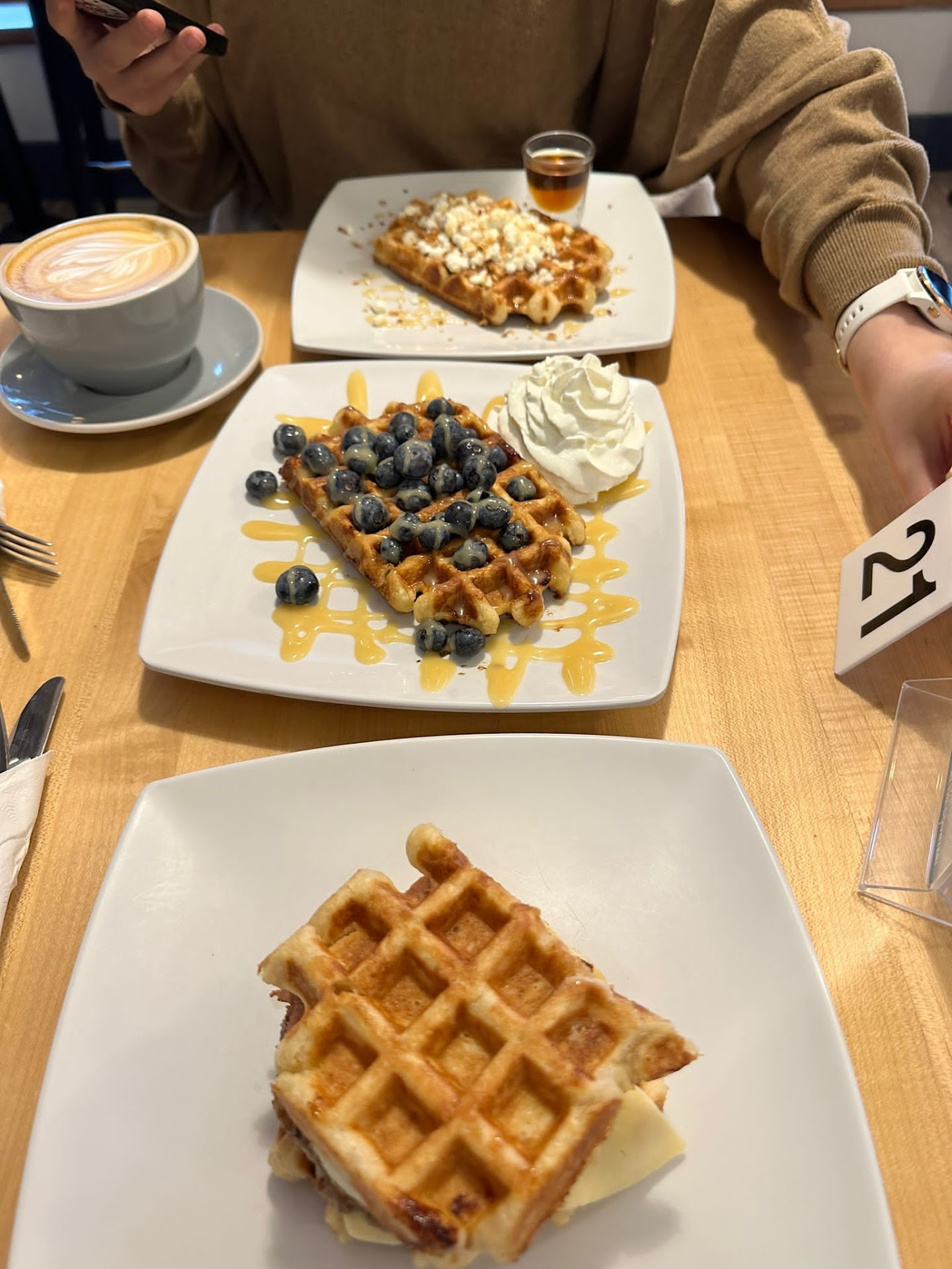 Due to sleepy lazy Sunday reasons we did not have breakfast this morning and came here during lunchtime. We ended up getting two savory waffles and one sweet waffle. They were all really good. The Swanson did come a little smaller than expected, but it was great taste wise. The Audrey was savory and delicious, the goat cheese was perfect and not too goat-y. Unfortunately the Leslie Knope was out of season, so we got the JG2 instead.The lemon and blueberries made it taste very fresh and 'healthy' (as far as waffles can be healthy), I personally also appreciated that the whipped cream on this waffle was not overly sweet. Despite getting 1.5 waffle each we did not feel like our stomachs were about to explode, which we did actually expect, but that's on us for skipping breakfast.