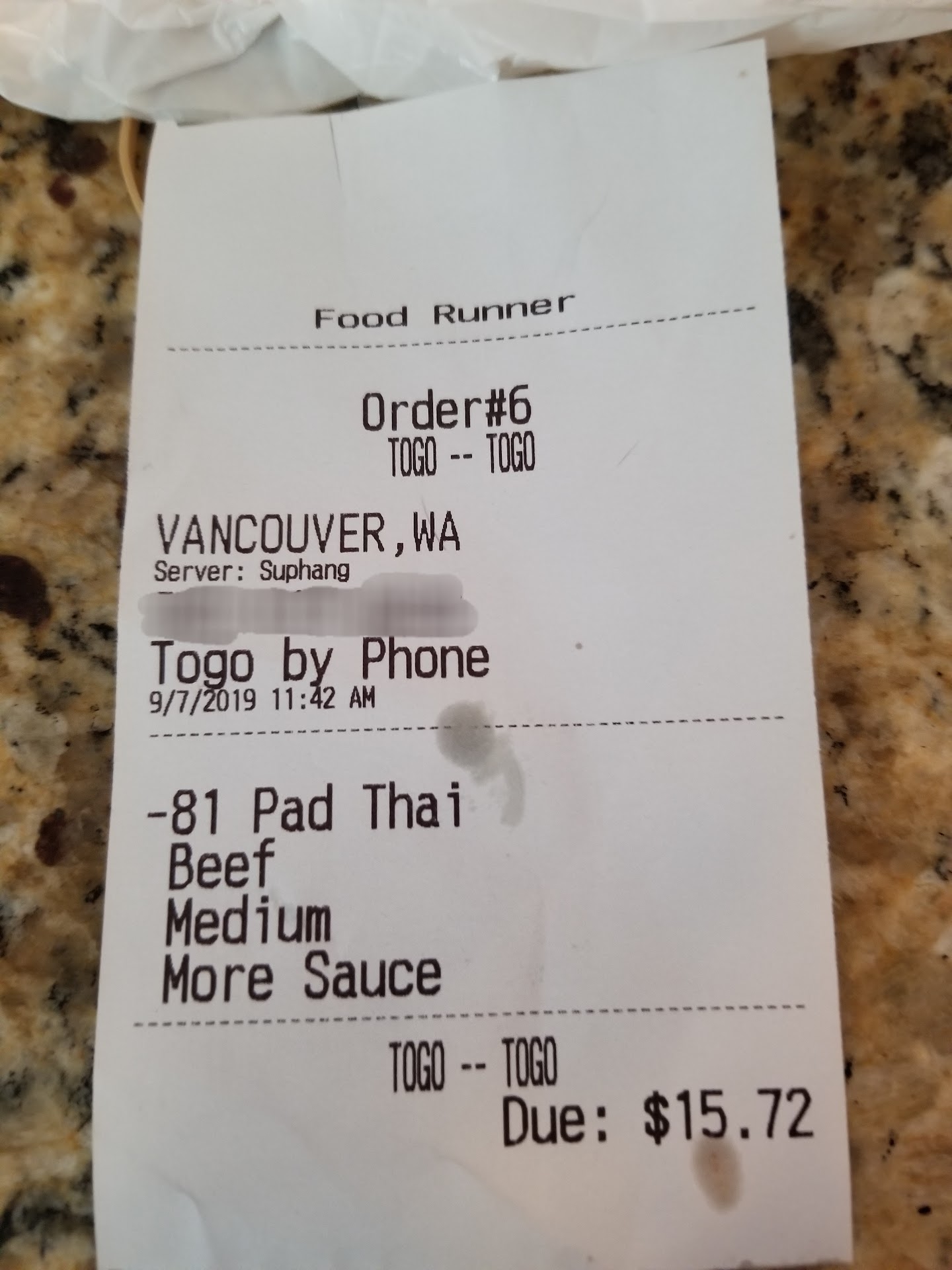 Waitress A comes by five minutes after we get our food and asks if we want anything else. We say no. Then Waitress B comes out at 8:26 pm and asks if we want anything else. We say no. TWO MINUTES LATER AT 8:28 PM, WAITRESS A DOES THE SAME THING AGAIN. I turn to her and say "Someone just asked me that two minutes ago, so no thank you and please let me eat!" That wasn't enough for her, though. Despite the both of us having two TOTALLY FULL water glasses, she came back five minutes later asking if we wanted more water. At that point, I was done with Thai Terrace. I asked for a to-go box and she brought it after the single check (and she never asked if we wanted to split the check or pay together, so that was obnoxious and unprofessional). It was 8:38pm when we left.