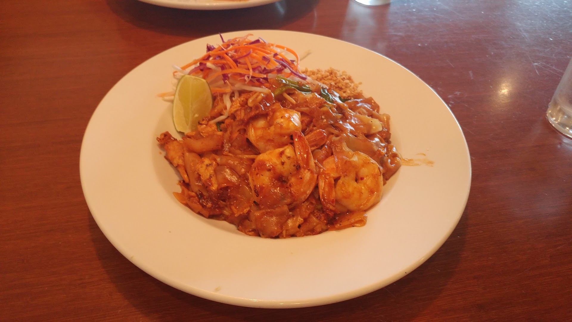 Back to the waitresses though. Waitress B comes out with the appetizer and sets it down, so I thank her and try to enjoy the Golden Flower (which is a thin, crispy rangoon with very light crab flakes in the cream cheese). Our entrees come out in record time, a few minutes apart from each other which was fine, and they're pretty good (garden curry noodles and panang curry were both nice, standard lightly spicy, fragrant, coconut milky flavor).