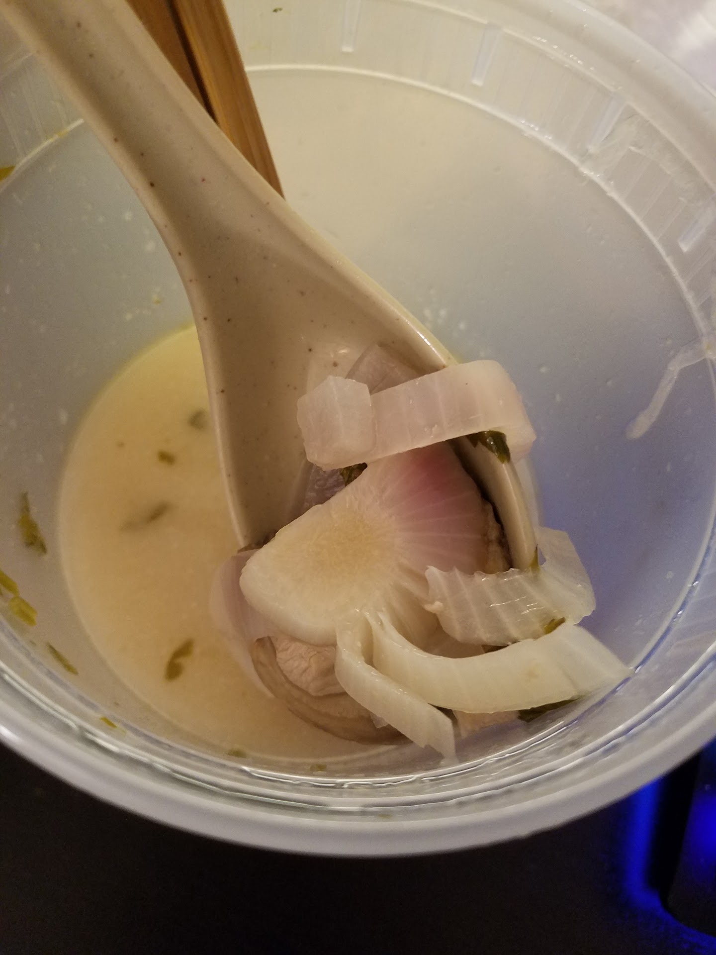 the lettuce in the spring roll tastes like the kind they put in the "burgers" in elementary school lunchs. the mushrooms are bruised and taste very off. some pieces of the chicken were okay, but most of it tasted old or freezer burnt or something. and the onions are transparent and losing color, on top of there being the core of an onion in my tom kha. the peanut sauce that comes with the spring rolls was a super lumpy and weird texture. and the crab fried rice was somehow super bland. the ingredients were definitely already on their way out when they were hitting the frying pan. either that or we were given dishes that were left out and re heated or somethin. on top of all the food tasting old (admittedly i shouldve taken a photo when we first got the order) my soup wasnt even all the way full when i got it. it was almost 2 inches off the top.