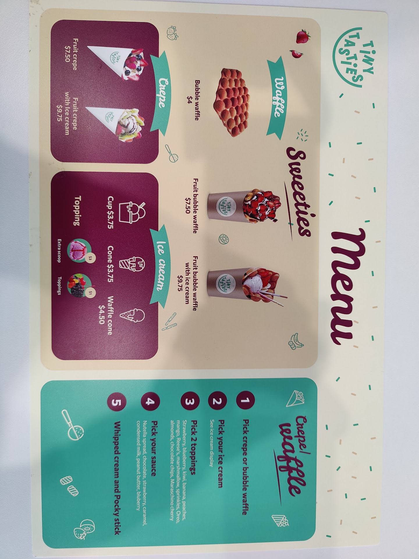 Read moreI love Tom Kha soup, and stumbled across Tiny Tasties today when I was in the area. Thinking it was only an ice cream type place at first, I looked at the menu posted in the window and was happy to see my favorite soup. I went into an empty restaurant and ordered some to go. Staff was friendly enough and polite. The order took a LOOONG time to come. I was surprised since I was the only one in the store. Finally it came and was handed to me. Again, I was surprised because the bag felt really light for what I would expect for the container of soup and compared to other places. The container was only about 1/2 - 2/3 full of soup! I measured when I got home - it was only 2 cups of soup for $12, which seemed pricey. The Tom Kha tasted good, had a lot of flavor, except it was very heavily salted for some reason. (I like my food somewhat salty, so if I notice it tasting TOO salty, it must be pretty extreme.) I might give them another try again for a different menu item. It's a cute store, clean, interesting items to look at, and books for kids on the wall, or games if you want to play...