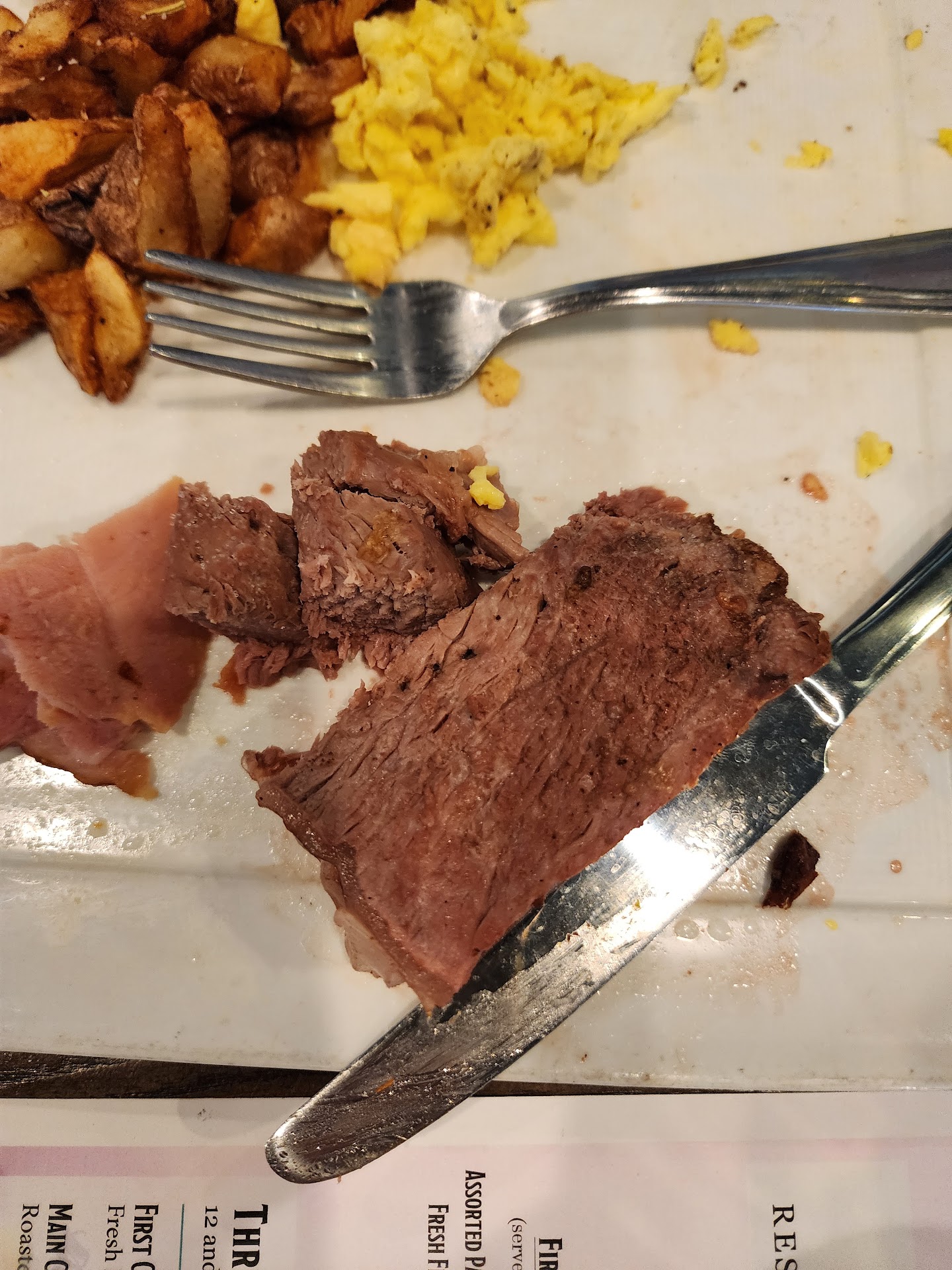 Main course was disgusting. The ham was tiny, prime rib GRAY ( and unable to cut with our only knife a butter knife), a literal round ice cream plop of scrambled eggs and cold potatoes. At this point we had asked for water refills 3 times, never did get one. We had asked for coffee refills, they filled 1/2 and walked away. We asked for a steak knife, never did get one. All 3 main meals were left uneaten. When pointed out to our server she literally shrugged. Final dessert was dropped. Again "family style" with no plates and no silverware. We asked for both and finally got spoons. The shortcake you couldn't serve and the TINY brownie and rice crispy couldn't be divided.