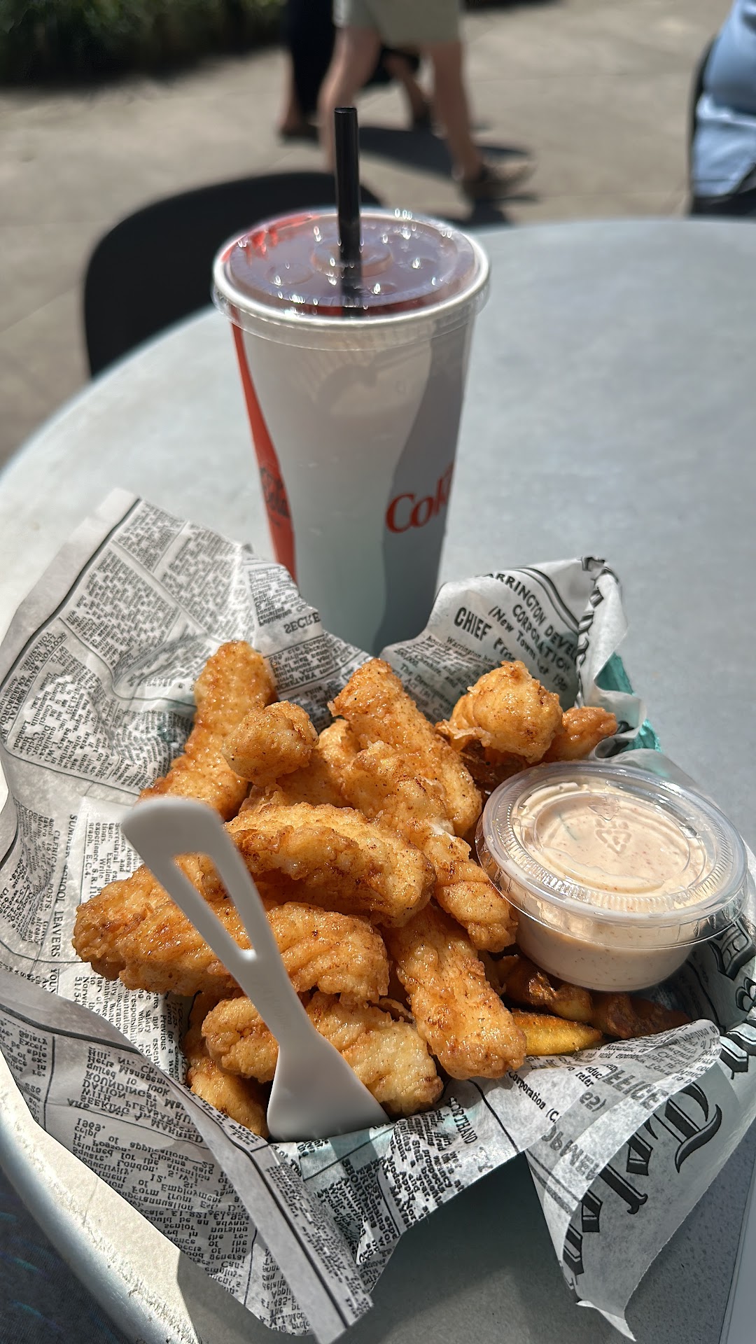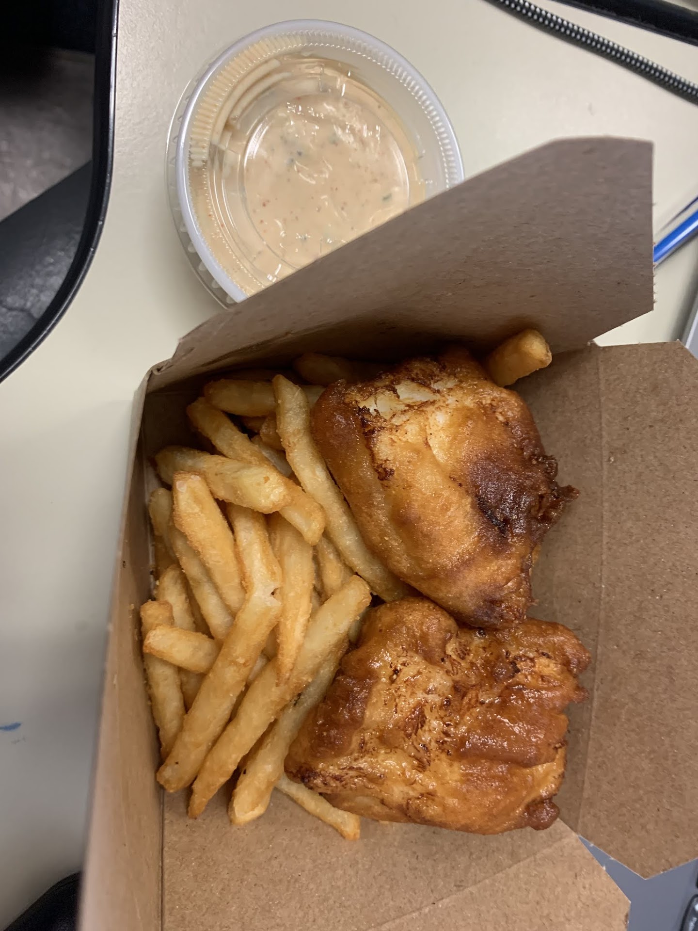 I ordered 3 piece cod fish and chips, my wife ordered the calamari. You get your entire meal. You get your meal shoving into a tiny box with your fries buried on the bottom.