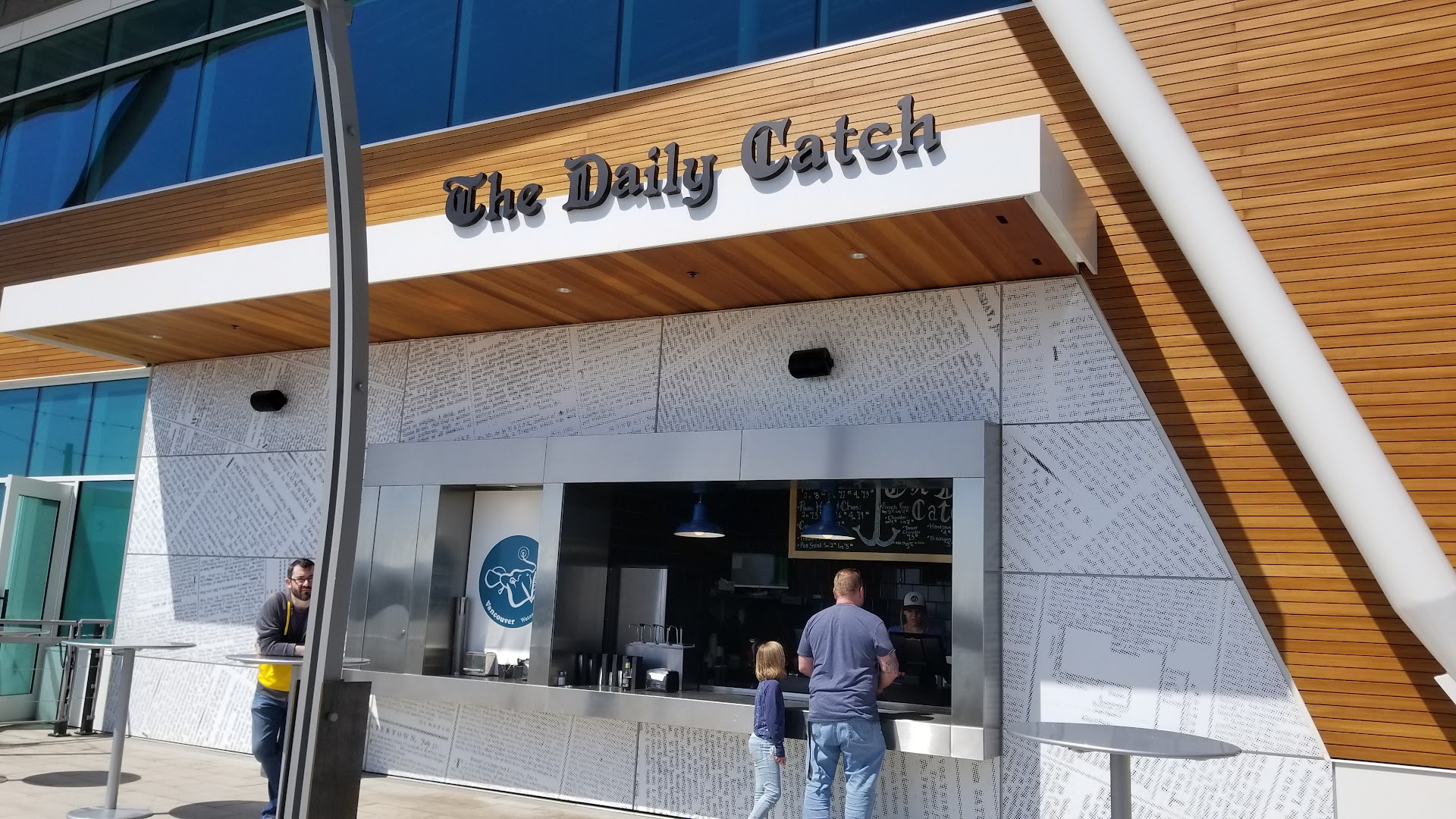 I so wanted this place to be good. What fun, a fish shack on the waterfront. Alas, I was sadly disappointed. It started with the sullen staff that took my order and served my food. I went out to the limited stand up table area set aside for the "fish window" (not allowed to sit in the Wildfin area, what's up with that?!) only to find greasy, food stained tables. I walked back and asked for a rag and a staff member reluctantly came out and wiped off the tables. I asked if it felt good to get out of the kitchen and was answered by "I just want go home." On to the food. $13.99 for a single, large, flour tortilla wrapped Banh Mi style taco that took me three bites before I found any fish, which once I did find was tasty, but minuscule. No joke.There was so much cilantro stem that every bite I took dragged a long piece out covering my chin with aioli. Yuck. Accompanying the 'taco" was a pint sized fruit box filled with tortilla chips that I am certain were pulled from a bag, no salsa. What??? Judging by the garbage can that we disposed our containers in, many felt the same way as it was packed with full chip containers. What a sad waste, on many levels. My partner had the two piece cod and chips for $10.99 and she was okay with it, nothing to come back for. We both ordered what sounded like an intriguing lemonade - blackberry and basil. Unfortunately it was so syrupy sweet the flavors could not shine. We both dumped ours in the bushes after a couple of sips. It would have been nice to get a beer or a cider, but those were not offered. Unfortunately, I would not recommend this place nor return, which is too bad cuz it's a great location. I really don't like writing bad reviews, but I couldn't not write this one. Don't waste your time or money. I gave it two stars only because my partner was okay with her meal.