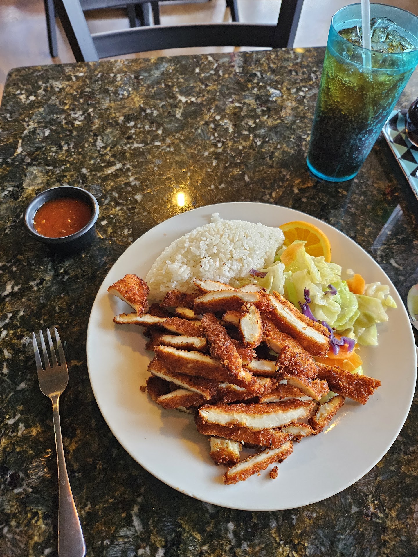 for dinner I had the teriyaki chicken with the tempura shrimp, the tempura was perfect Nice and light, The sauce that came with it was not too salty it was liquidy which is perfect for the temporar to soak it up. teriyaki chicken, hey it's teriyaki chicken what can you say about it? it's pretty standard but it's good as hell, I'm excited to try the other menu options.