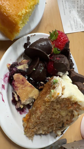 The food was surprisingly good. The food on the salad bar was fresh - crunchy veggies crunched, lettuce was bright green, etc. Caesar dressing was good, but ranch dressing was watered down and lacked flavor. The steak was delicious, as well as the green beans, bourbon chicken, roasted chicken, and yeast rolls. The fried shrimp and corn muffins were good but not spectacular. The ribs tasted good but were overcooked. The sweet tater casserole was good flavor but weird texture. Desserts have been pared back but still a lot to choose from. Everything was tasty. They make the chocolate fountain marshmallows ahead now (covid) and they were surprisingly tasty, though I would like them as singles rather than 3 on a stick. Brownie was a smidge dried out from sitting out but still filled that chocolate need. Bread pudding was hot and just the right amount of gooey. The cheese cake and carrot cake were solid.