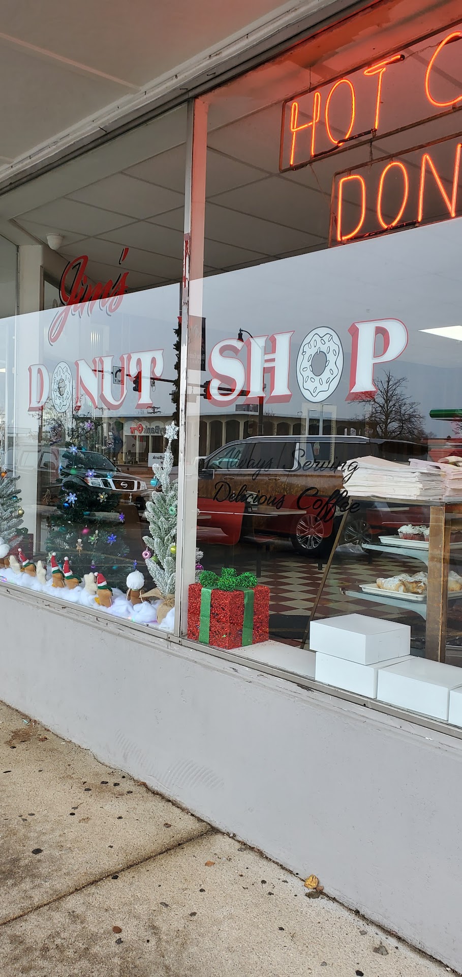 Read moreOh my word! I cannot say enough nice things about Jim's Donut Shop. I told my husband I had a craving for a donut, and neither of us wanted to try a chain donut place as we had been disappointed before. So we decided to give Jim's Donut Shop a try. I am so glad that we did! The variety of donuts and other breakfast Sweets were abundant! My husband is a fan of apple fritters and blueberry donuts, so I got those for him. The apple fritters are HUGE! I am a Bavarian cream donut girlie so I got that. Something else caught my eye that I had to try: the apple donut sandwich. Ohhh my good Heavens. Sooo scrumptious! The young lady helping me was such a delight. There were several patrons seated and enjoying their coffee and conversation as well. We will definitely consider this...