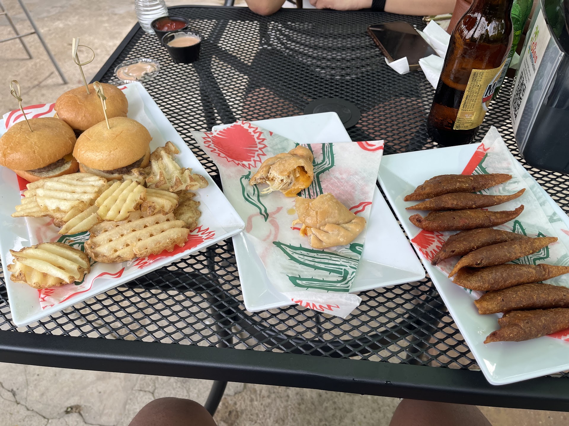 This was my first spot to try in Puerto Rico. It was close to our resort and figured after a long day of traveling we’d walk and try this place out. It’s a small place with good amount of outdoor sitting space. Everything on the menu sounded good. We tried the burgers, the chicken turnovers, and alcapurrias. I also tried the local beer called medalla light. All the food comes out hot. The flavor on the burgers were ok. I could go without eating them again from here. I loved the chicken turnovers and enjoyed the alcapurrias. I’d order those again. The beer was really cold and wasn’t bad. It was a really chill vibe there and we must’ve went at a slow time. Seems like a good amount of ppl stop here. I will be visiting this place again...
