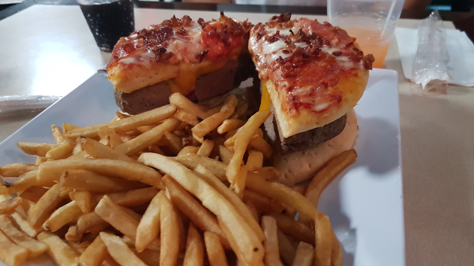 2.5 realmente la experiencia no fue muy grata llame para ordenar y cuando les dije que queria un pizza burger me pusieron en hold para preguntarle al cocinero dijeron que no avia le explique a la chika que vengo de carolina y estaba llegando y me dice esperate me pone en hold otraves y me dice que puede conseguir la carne lo ordeno y ademas ordene un mofongo con carne frita. Llegamos 15 minutos despues de aver ordenado y esperamos unos 20 minutos para la CARNE FRITA CON MODOGO el mofongo no nos impreciono estaba muy seco el sabor no era nada especial la carne frita estaba muy buena la ensalada era solo lechuga y tomate pedi mayokechup y se tardaron 8 a 10 minutos en traernos eso y la bebida y unos 20 minutos mas para el pizza burger ya aviamos terminado de comernos el mofongo y la carne frita cuando unos minutos despues llego el PIZZA BURGER es perfecto para 2 personas la carne es muy buena el hamburger estaba cocinado a perfeccion pero solo le exharin queso chedar y se supone que llevara americano provolone y chedar le faltaron ingredientes lo mismo con la ensalada y se supone que tenian un adereso de la casa que ni nos lo ofresieron .... no se pero yo digo que no vale la pena el viaje a vega alta para eso ... sali lleno pero desepcionado. Note que nadie pidio nada al plato todos ordenaban pizza quisas si hubiera pedido solo pizza la experiencia uviera...