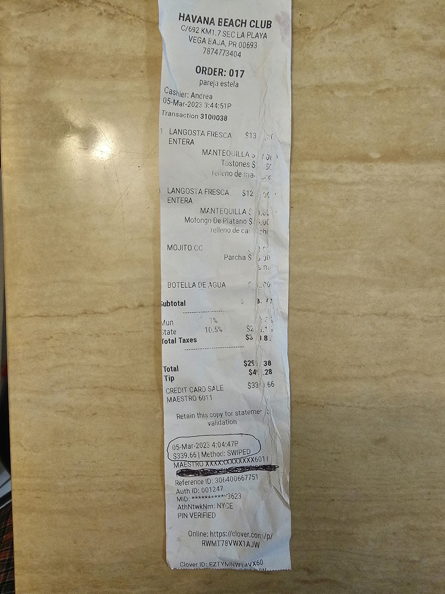 I went with my wife and we asked the waitress about the price of the lobsters and she replied that she didn't know what she had to ask. After waiting a few minutes and seeing her pass by my side, I decided to ask her again, and she told me that she had not verified yet. Since I did not continue to waiting i decided to order 2 small stuffed lobsters. When the food arrived, I noticed that the lobsters were not small, I understood that with only 1 we ate both, but they never explained to us that only 1 lobster was enough. At the end I had to get up and ask for the bill since they never came to the table, to my surprise the price for the 2 lobsters was $270.00 1 bottle of water and a mojito with tax 298.00. I almost had a heart attack, although I admit that my mistake was not waiting for them to tell me the price and ordering taking as a reference other nearby restaurants in wich a small lobster (1 -1/2 pound) the price is around $70.00 At the end I paid 339.66 with the tip. I have been to Europe, USA and other countries I have eaten in good places and I have never paid so much for 2 people. To make matters worse, we ate outside, and there were many flies. The lobster was not very good, and the mofongo seemed to have been made with frozen bananas. In summary, I do not recommend it to anyone. I attached the receipt, but the paper got stuck in the ath machine, and it can hardly read the details of each item. However, you can read the order, and i circle the...