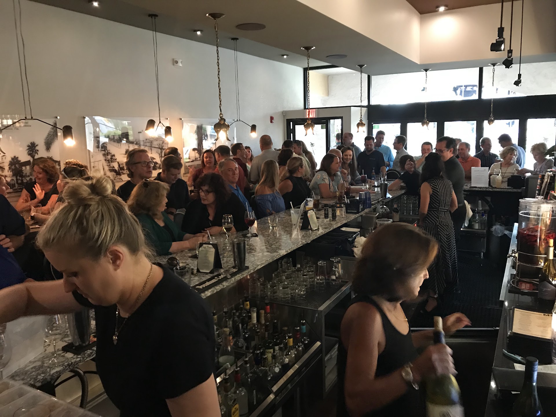 Hooray! There is a hotspot in Venice on a Monday night. Guest bartender Gregg Hassler featured a delicious Old Fashioned cocktail. The crowd was friendly and lively. I was happy to run into other people I knew. A nice feeling for someone fairly new to the area. We enjoyed ourselves and the atmosphere so much that we decided to get a table and stay for dinner. The booth was comfortable and quiet. The whole restaurant was well decorated and planned. Great location. We spent $100. Including the cocktail at bar. I thought the $10.00 drink was a little pricy for happy hour but then was hoping that some of that went to help the charity they are raising money for. Food was good except must report that the mashed potatoes were dry and uninteresting and the mushroom sauce on the pork didn’t have much flavor. We both ordered a wedge salad. I had the blackened Delmonico steak and my friend had the roast pork tenderloin. The pork tenderloin came with pink areas in the middle. I know it’s popular to specify a doneness with pork but he was not asked so we thought it should have been fully cooked. My steak was perfectly cooked but there was not much seasoning and wasn’t really much different from a grilled steak. (It should have been blackened.) Service was excellent except for one major problem, which completely changed the atmosphere and pace of the dinner, hence only two stars. We had hardly started our salads and then dinner arrived. We are not slow eaters and started on our salads as soon as they were brought out. Our dinners were brought by someone other than our server and sat there on the end of the table while we finished our salads. She offered to take them back but I asked her to leave them thinking that they would just sit back there in the kitchen under a heat lamp overcooking my steak and drying out everything.