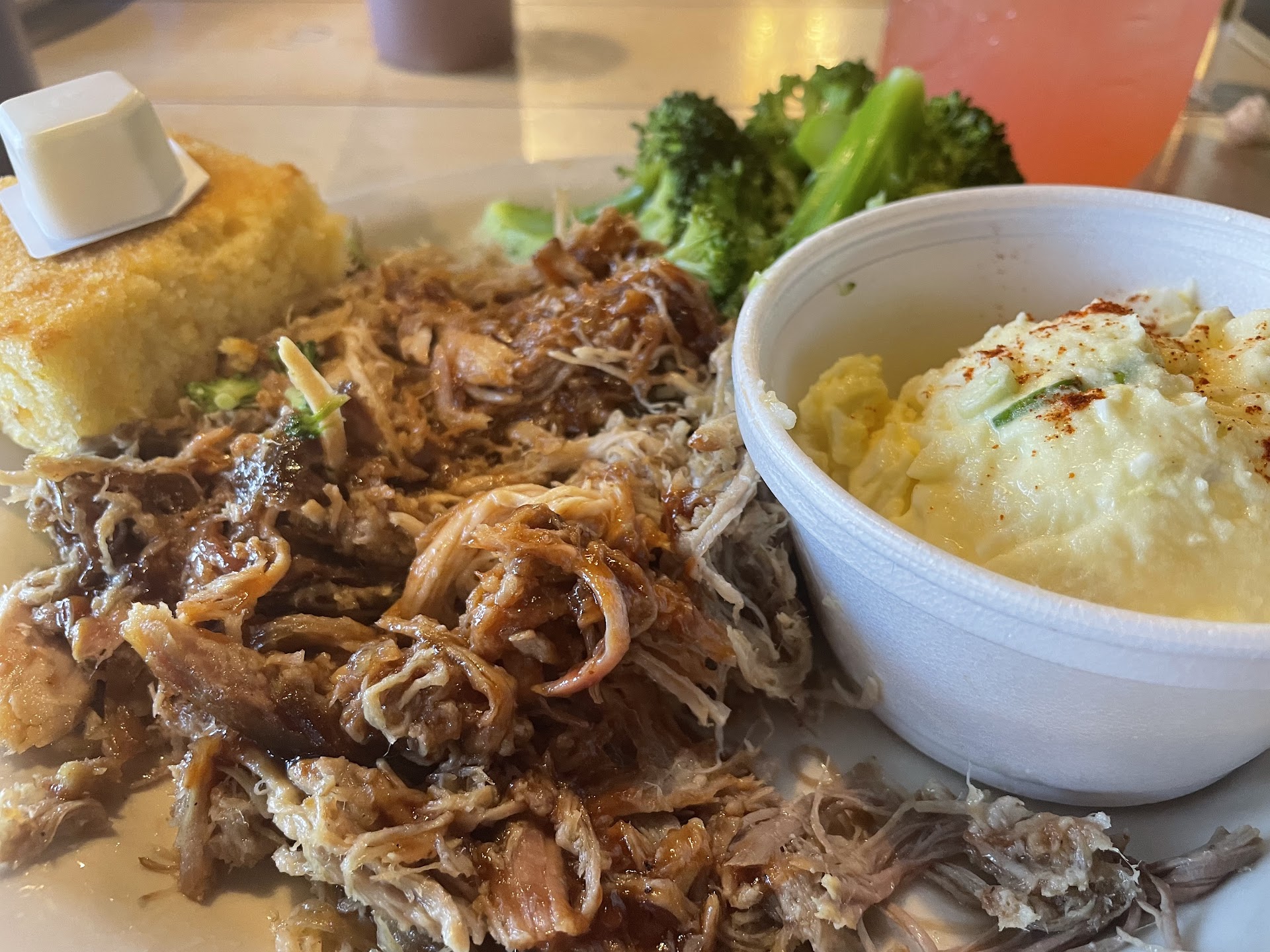 Read moreWe ordered water and lemonade to start. The mason jars they came in were very large and I did not require a refill. The food was really good … after I added the available BBQ sauce to my pulled pork. I tried the pork plain, as it was served, and it was moist and I found zero fatty pieces. The flavor of the plain pork was, just that, plain. However, once I added the BBQ and mixed it well, it was delicious. Two others in my group had the brisket sandwich and the fried chicken. Both said they would come back. As will I. I would like to try the ribs. I ordered my pulled pork with a side of potato salad and broccoli. It also came with corn bread. I was overall very pleased with my meal and the price. Our server, Lisa, was very nice and friendly. She did however forget to mention the specials to us but it would not have changed my mind and there was a board showing the specials. The owner/manager (?) came by and he was very enthusiastic and he thanked us for coming and checking to see how the food was. I also heard another young man being friendly and thanking his table for coming. The service gets 5+ stars if I could give it to them. The next time we crave BBQ, we will think...