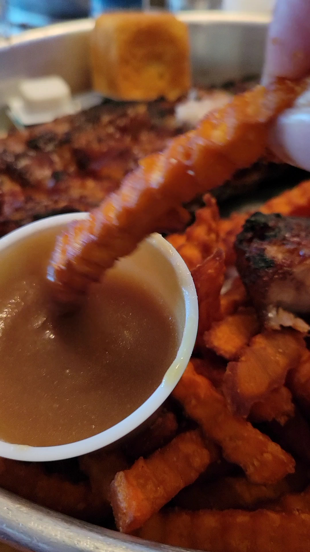 Read moreWe found a gold mine, in the Gold Rush BBQ Restaurant! The food where to begin? I guess with the fried pickle chips appetizer with regular ranch and spicy dipping sauce, they were very good. But LOTS of people ordered the onion strings, and they all but licked their plates clean too! Our pickle chips were also crispy and tasty! My husband and son both got the chopped pork sandwich with cole slaw and fries. I ordered the St Louis ribs with collard greens and sweet potato fries. The collard green, so good, the ribs, loaded with all the crispy sticky pieces I love and meaty! The fries, I love me some sweet potatoes, any way I can get them, these come with Susie's sweet dipping sauce. I brought the rest of this dipping sauce home with us. I am sure I will find something to dip in it or spread it on, I am not parting with this liquid gold! I have had to stake my claim on this stuff though. My husband is thinking of jumping my claim, he is thinking about what he can use it on?