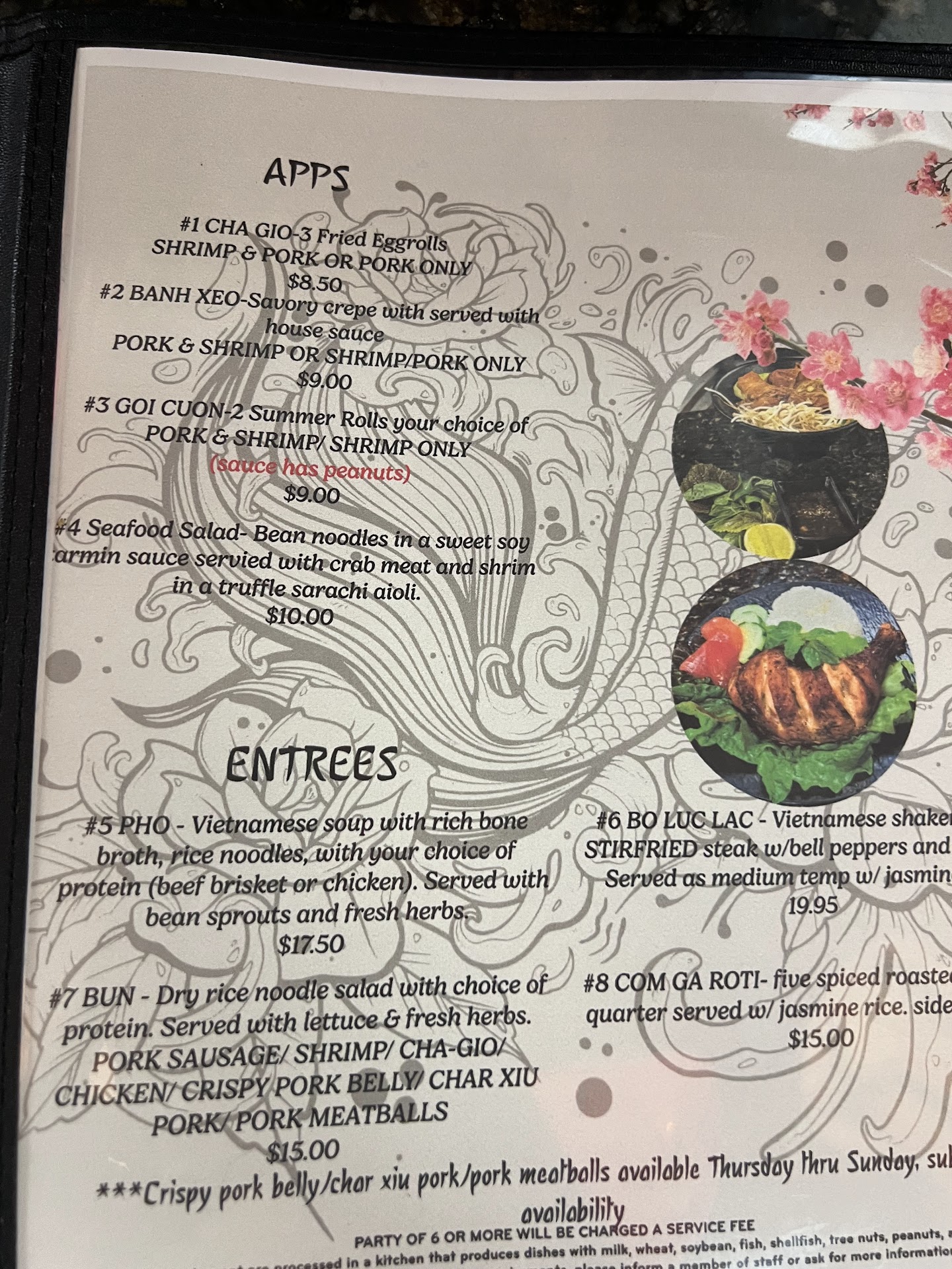 The menu offered an impressive range of traditional dishes, but I started with the fresh spring rollsāpacked with herbs, shrimp, and vermicelli, and served with a perfectly balanced peanut sauce. For my main course, I chose the classic Pho Tai, and it did not disappoint. The broth was rich and aromatic, clearly simmered for hours, and the rare beef was tender and flavorful. The portion was generous, and the accompanying herbs and lime wedges were fresh.