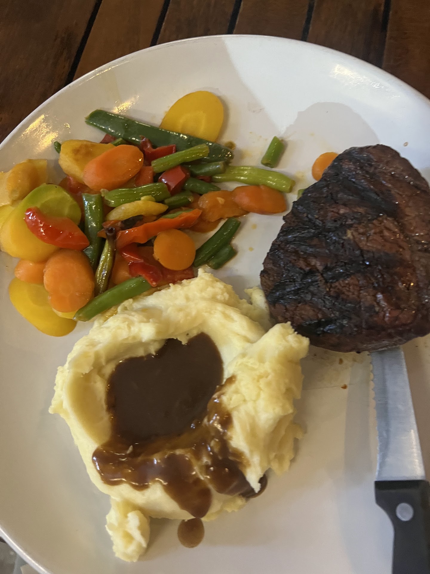 Pros: ~ David our server was very pleasant and attentive. I was surprised to learn he’s new to working there when we were on our way out. ~ The steak fajitas and chicken pot pie were very good. ~ We sat outside and even though we were right by the road it’s a nice area to sit in. You don’t feel like you are sitting in traffic. Cons: ~ Getting a seat outside was a bit strange. People were taking available seats as other got up to leave without going in and asking the hostess to be seated. She was keeping up with them pretty well but some slipped past her, not her fault though, people should know better. ~ Today at least, there seemed to be a lack of support staff for the kitchen. Silverware was one issue. Our meals were served without silverware. I asked the young woman who brought our food for a knife and fork, she said okay and left. We sat for a few minutes and our server came over to ask if everything was okay, we again asked for silverware and he went to get some. Again we sat for a while as our food was getting cold so I went inside to the hostess station where I had noticed someone had been rolling silverware into napkins when we first went in to ask to be seated. I figured I'd just get the silverware from there. No silverware this time. As I was looking around for the silverware I was approached by a young woman who was holding a tablet who asked me in an annoyed voice if she could help me. I told her why I was there, she asked who our server was and for a description of him. I told her he already knew, then she wanted to know where we were seated, I showed her and she told me she would “tell” him. I shook my head and walked away. As I was walking away she yelled out in a snotty voice “THANK YOU FOR YOUR PATIENCE!!” I have a suggestion, when a dishwasher and busperson is needed, little miss snotty should have the tablet taken out of her hands and she should be sent to do dishes and bus tables, at least then she would be...