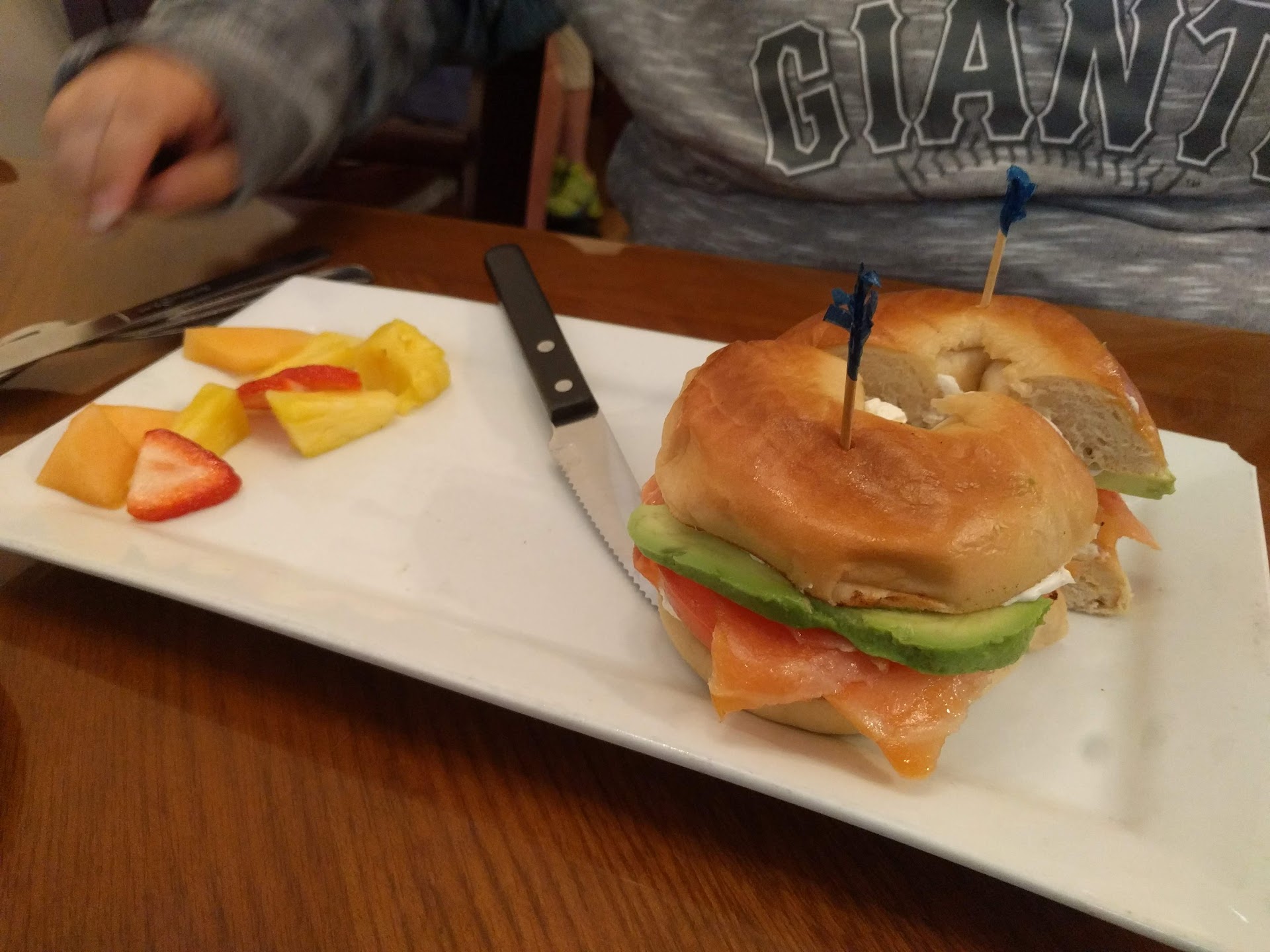 Long story, I stopped there once to have breakfast with my son outside in one of the umbrella shaded tables and told the waitress inside beforehand I was going to be sitting outside there, so they can be aware and come take our order. After waiting 15 minutes (and also know the joint wasn't even close to having a busy full house then), I decided to head back in to gently remind them we were outside. The waitress finally came with apologies and took our order. The food was served in a timely manner by a young waiter who wordlessly just plopped down our food and disappeared without giving us any utensils or our drinks. I had to go back inside and ask for our drinks and utensils. The eggs and turkey bacon my son ordered were quite noticeably and without exaggeration dripping with grease and the fruit tart. I ordered a crab cake benedict, which was very salty, but getting past the saltiness of it, was admittedly somewhat tasty. After breakfast, I went inside to get the check and the woman behind the cashier counter said to just wait for my waitress, whom I haven't even seen since she took our order. I sat down back outside with my son and chatted away, but after 10 or so minutes the waitress was a no show. I had to ask another waitress serving the other table next to mine to get our check, which she eventually did. My only consolation for regrettably going here was that I did not decide to give out an...