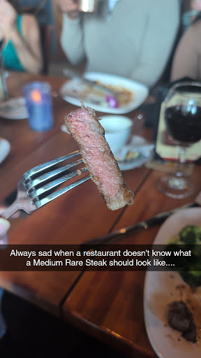 Just left this restaurant pretty disappointed overall. Came here for dinner to celebrate my best friend's birthday. Just some background, I'm from Nebraska and before I joined the Navy I worked at a steakhouse and bourbon bar. We had a party of 9 ppl, almost all of our steak was overcooked (we had 2 people who ordered the kebob with filet mignon that didn't realize their meat was unevenly cooked). I ordered the NY steak and another person party ordered the sirloin. We ordered them medium rare, but both were overcooked so we sent them back. The second steaks were also overcooked.... Mine was even worse than before except one small slice in the very middle of the strip. At this point the rest of the party was basically done eating so we agreed to eat the second versions because we were hungry. After we finished the meal they brought out some complimentary desserts both for the birthday celebration and to make up for the steaks.... By this point we also figured out the waiter brought one of us the completely wrong drink. He has ordered the perfect patron margarita, and what they brought him was pink, and it has mint in it. When we asked what the drink was the waiter said my friend asked for the rumberry, which interestingly enough does not say that it has mint in it. If it was meant to be a mojito, why not just call it that? The "complimentary desserts" were really just vanilla ice cream in a graham cracker crust covered with almonds and chocolate sauce. Nothing fancy. Not going to lie, when it was time to pay I expected some kind of discount or comp for the steaks... Having worked in restaurants for 8 years. I figured that would be pretty normal. We were informed by our waiter that the first steaks were comped because we sent them back but we were charged for the 2nd steaks (which were still overcooked) because we ate them. Not sure I personally will be back to this restaurant. Maybe for their seafood, but definitely not for their steak. If they're going to charge a premium price for the steaks, I do expect it to be cooked perfectly. All that being said our waiter Beau was very apologetic, and I understand most of it was out of his control. He gets 4 stars though only because he brought us a completely wrong drink, but very personable and attentive. May the odds be ever in your favor here if you order steak. Photo below is from a middle cut of my 2nd steak. The photo has not been edited....