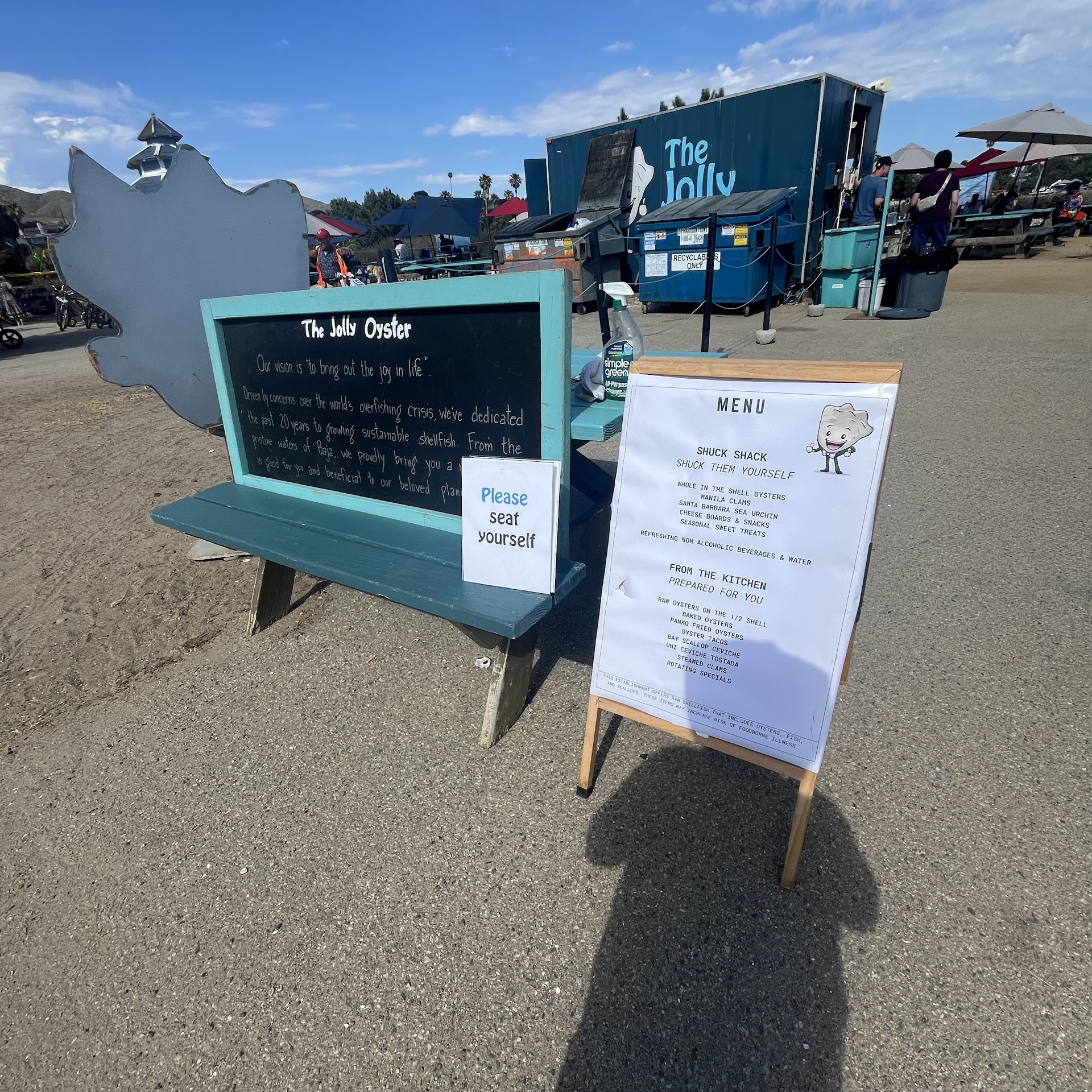 This place is located inside the San Buenaventura park. Parking cost is $10 and there are three lots. The Jolly Oyster is located in lot C which is on the other side of the entrance just drive all the way around. You will see lots of campers and picnic tables in this park. The Jolly Oyster is a simple food truck surrounded by picnic tables and a bicycle rental booth. From here you can walk trails that lead to the beach or just enjoy the beautiful grassy park. My advice is to come before 10am because parking starts to fill up pretty quick especially on weekends.